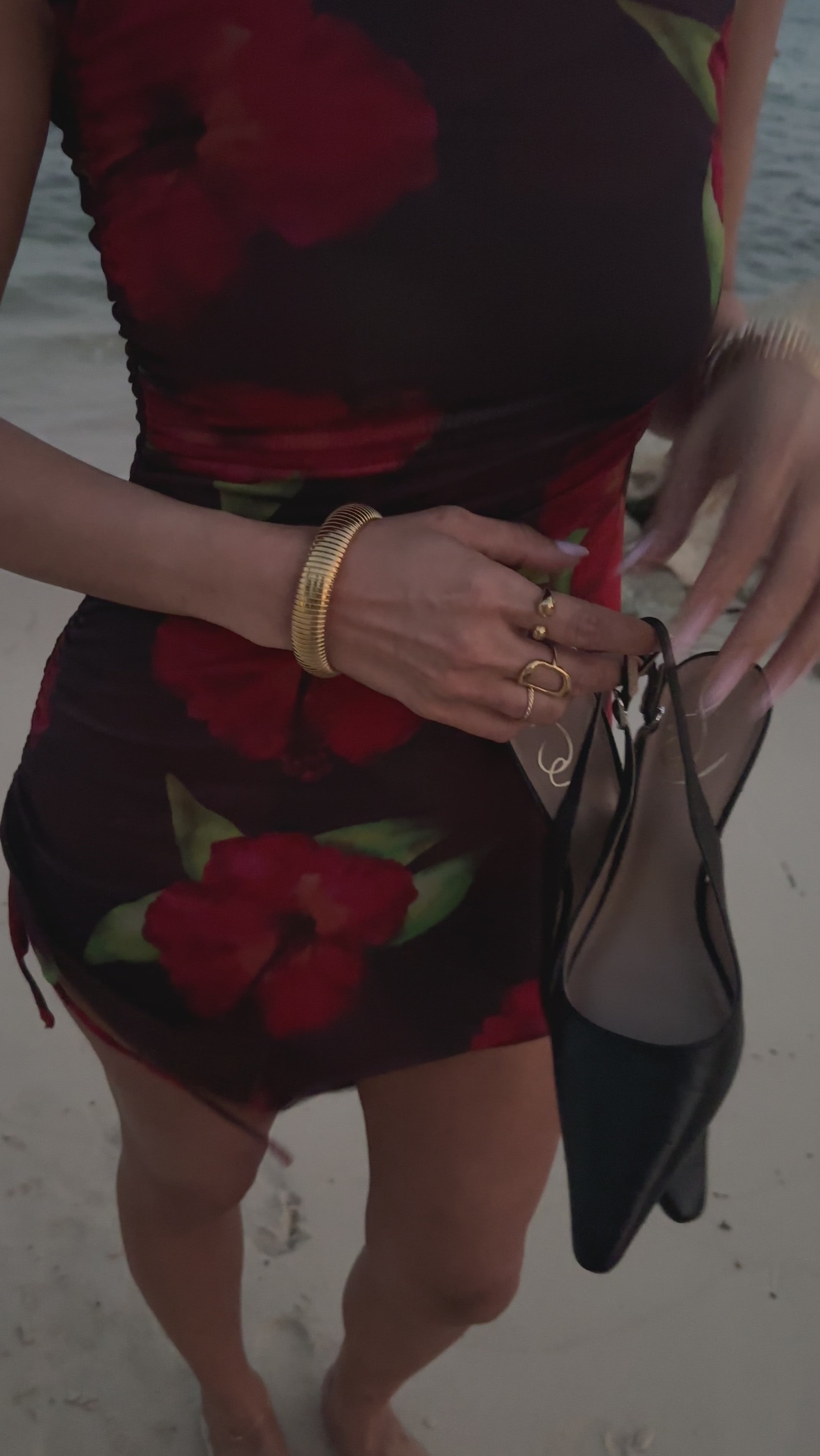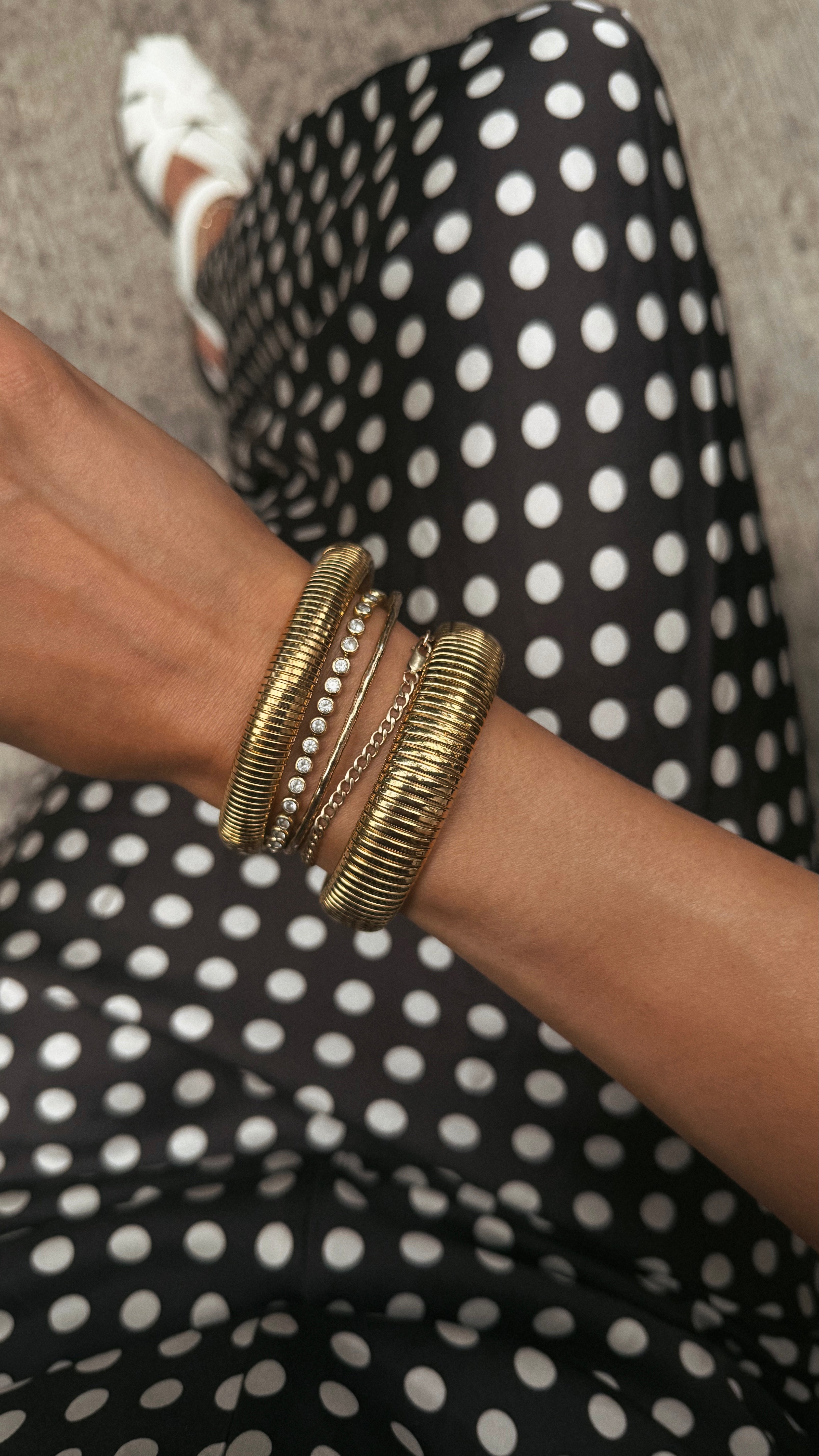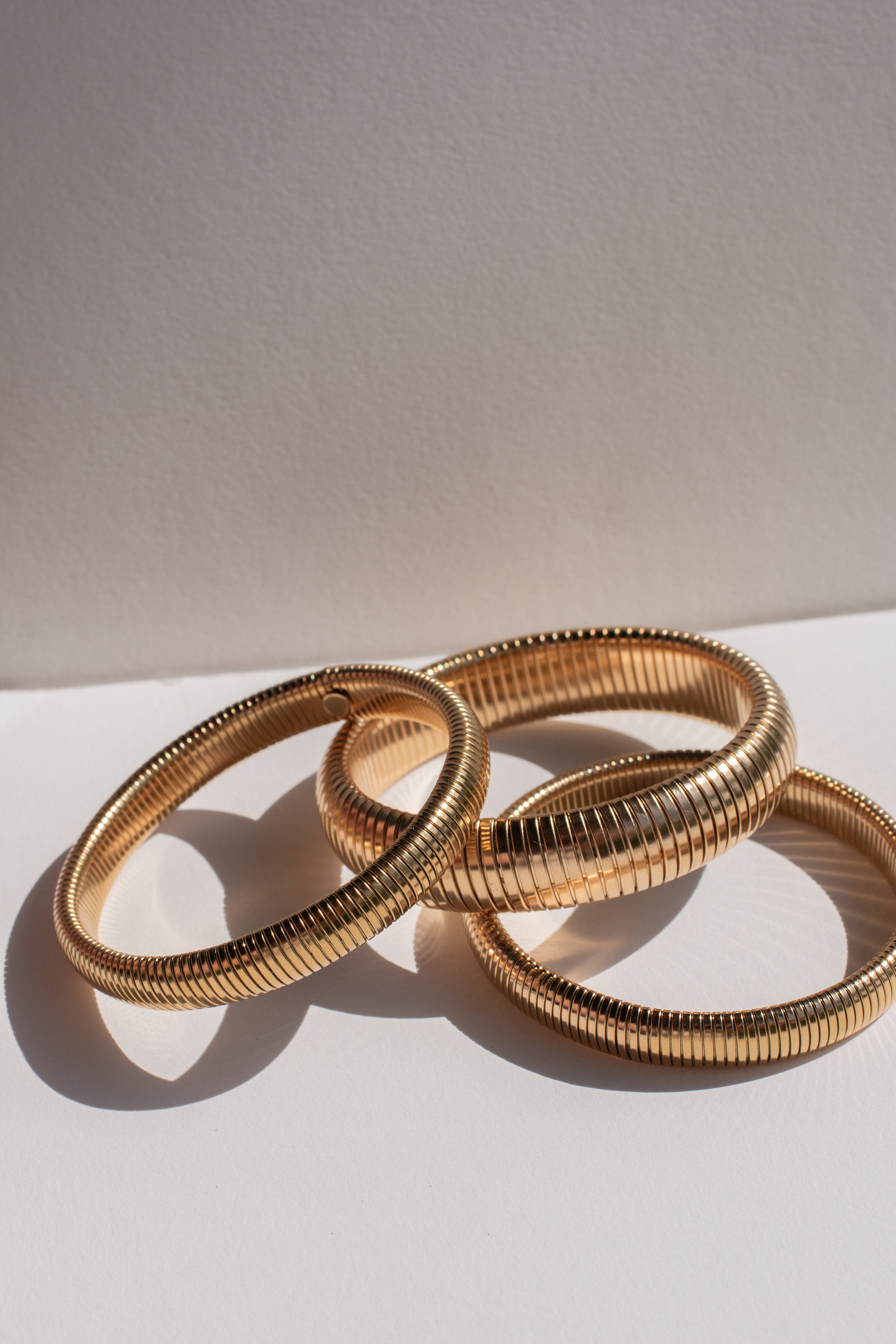 The Costa Thick Bracelet is our effortless, elevated version of a statement bracelet, with our mini and bestselling thin styles available. Elastic and noise-free, this Tubogas style bracelet has an elastic design, making it easy to slide on and off. Perfect for elevating your look from tanning on the beach to elegant dinners, this bracelet is made to be lived in.