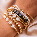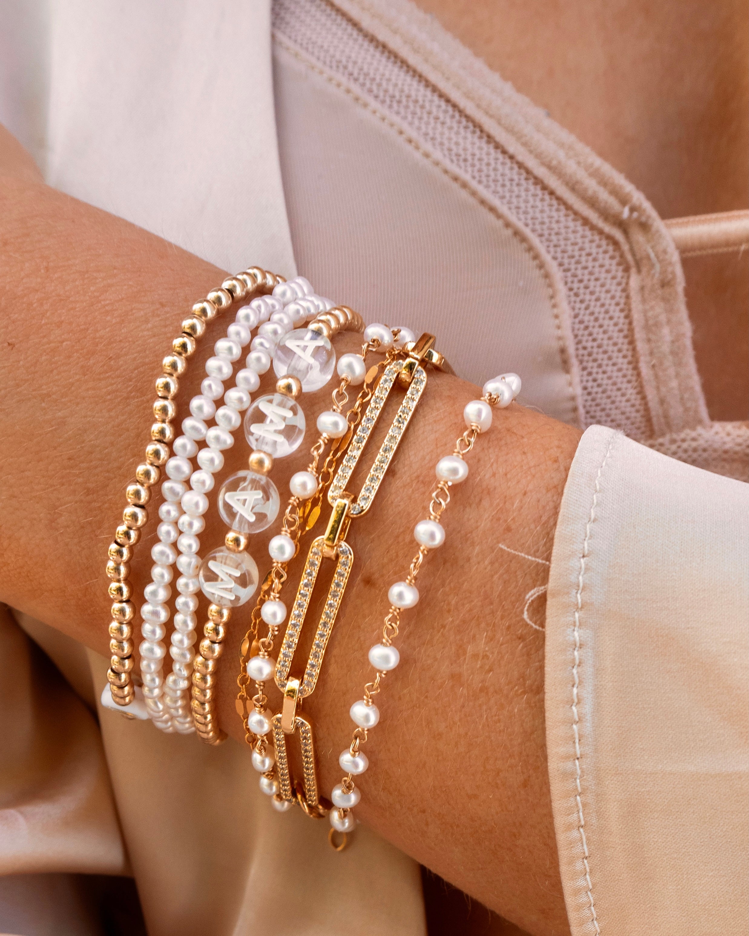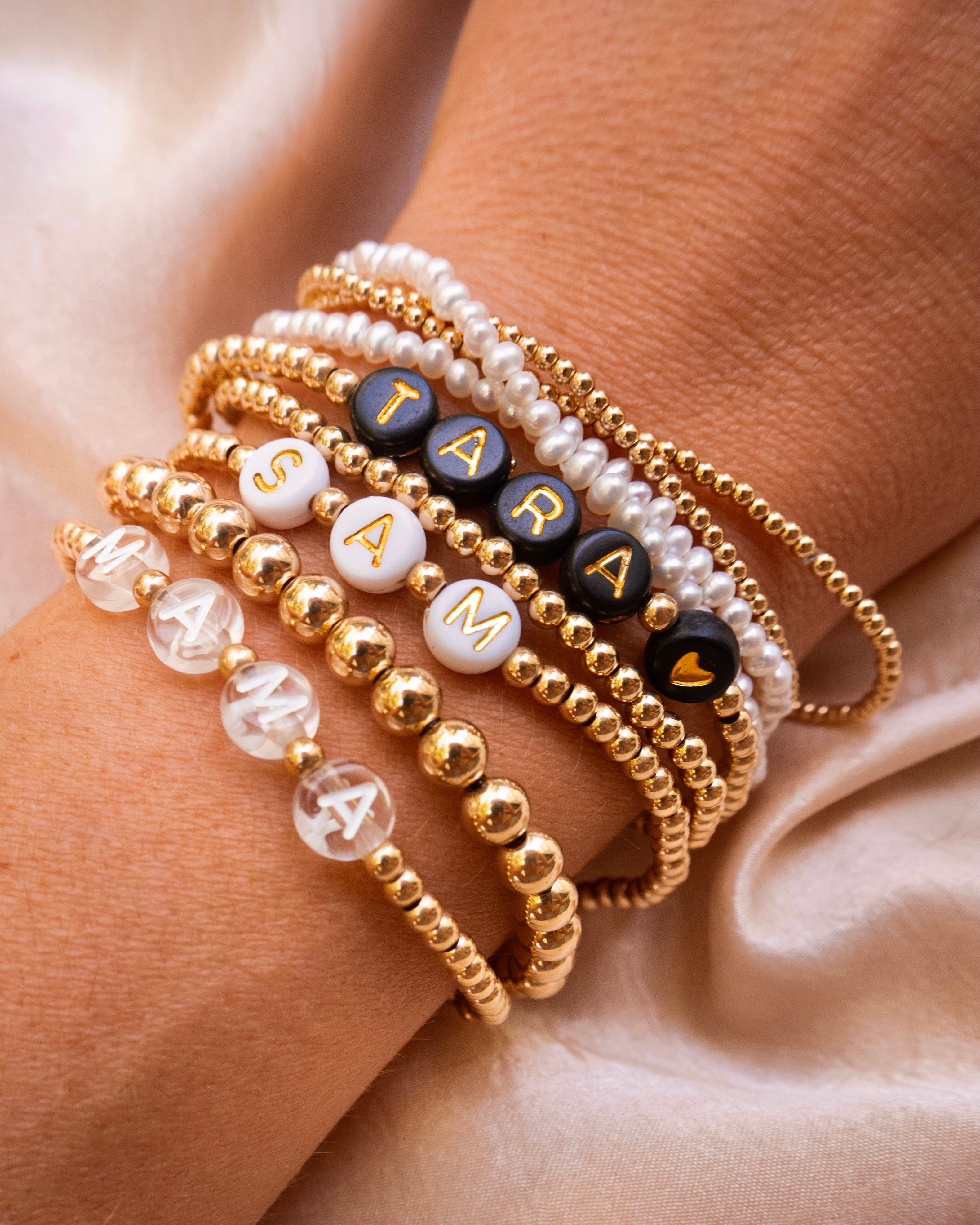 Trying to find a meaningful + unique gift for any person? These custom name bracelets are perfect for every occasion. Gift the new mother a "mama" bracelet or her child’s name; gift your BFF matching name bracelets; show some teacher appreciation with a custom bracelet. The options are limitless, and these bracelets will stack perfectly with our plain small and large gold beads.