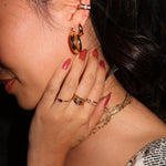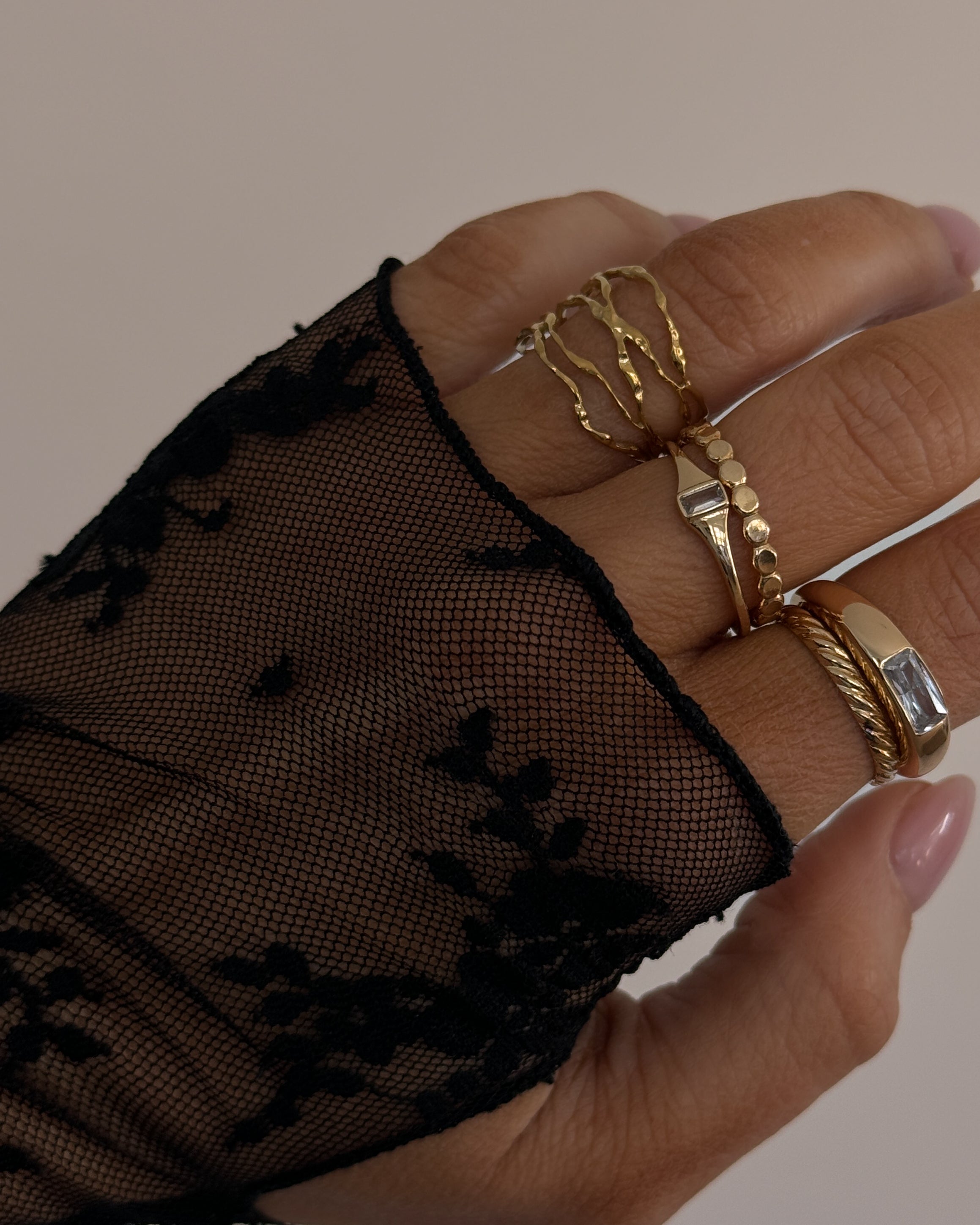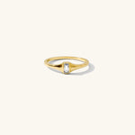 It won't take much to convince you that the Lina ring is a necessity in your collection. This ring features a thin signet silhouette featuring a clear bezel set topaz stone. This ring is pictured stacked with our Blondie and Stardust rings.