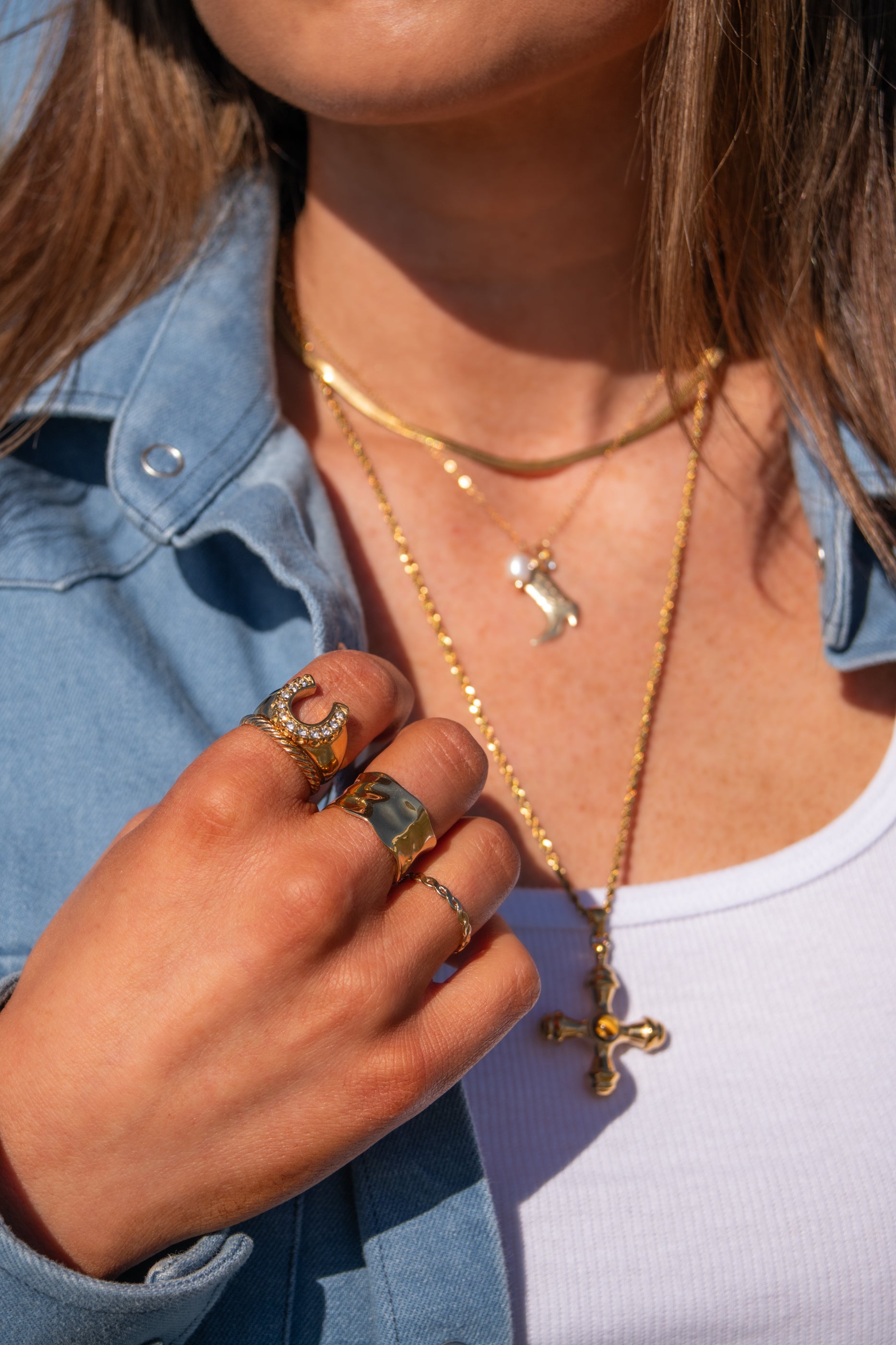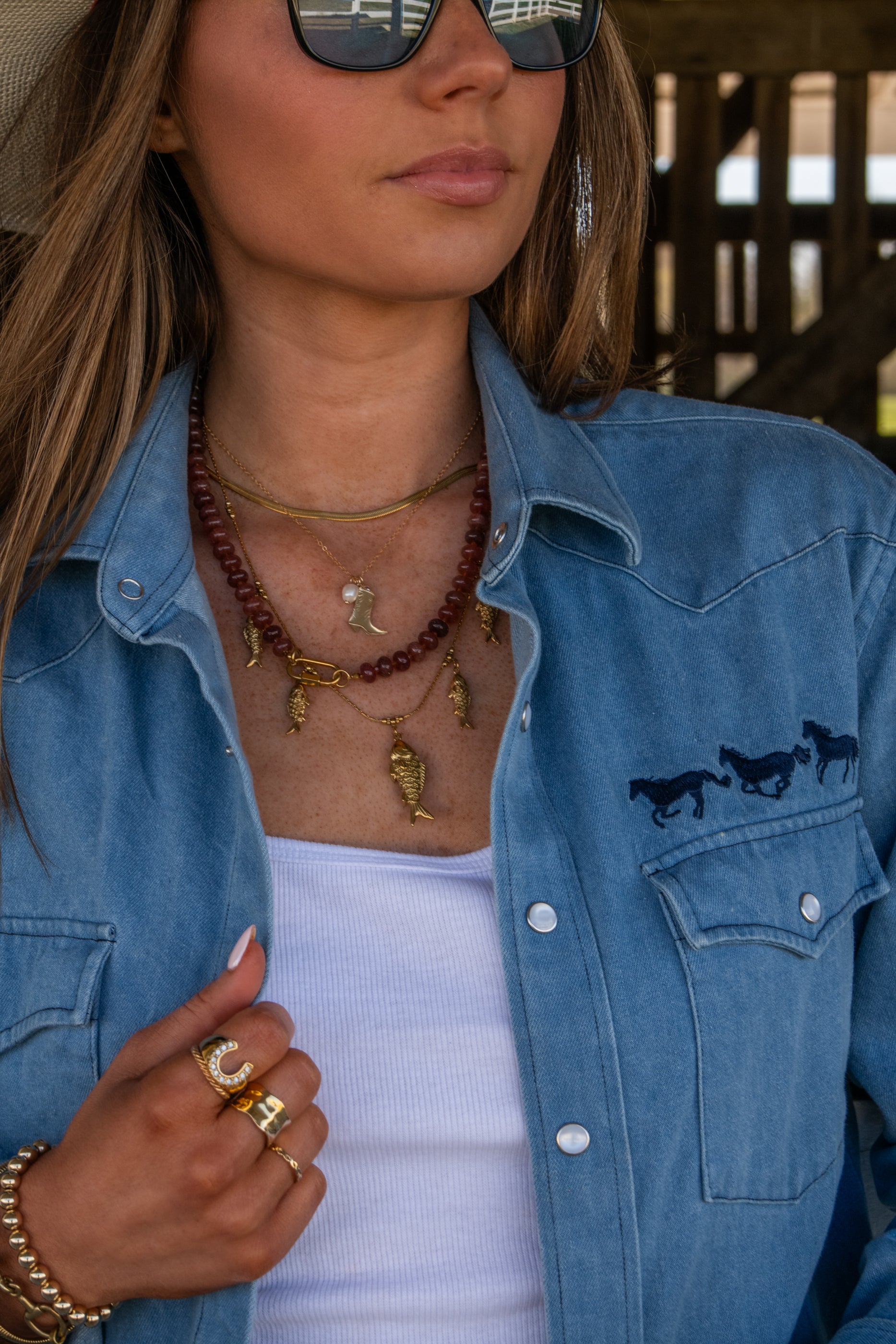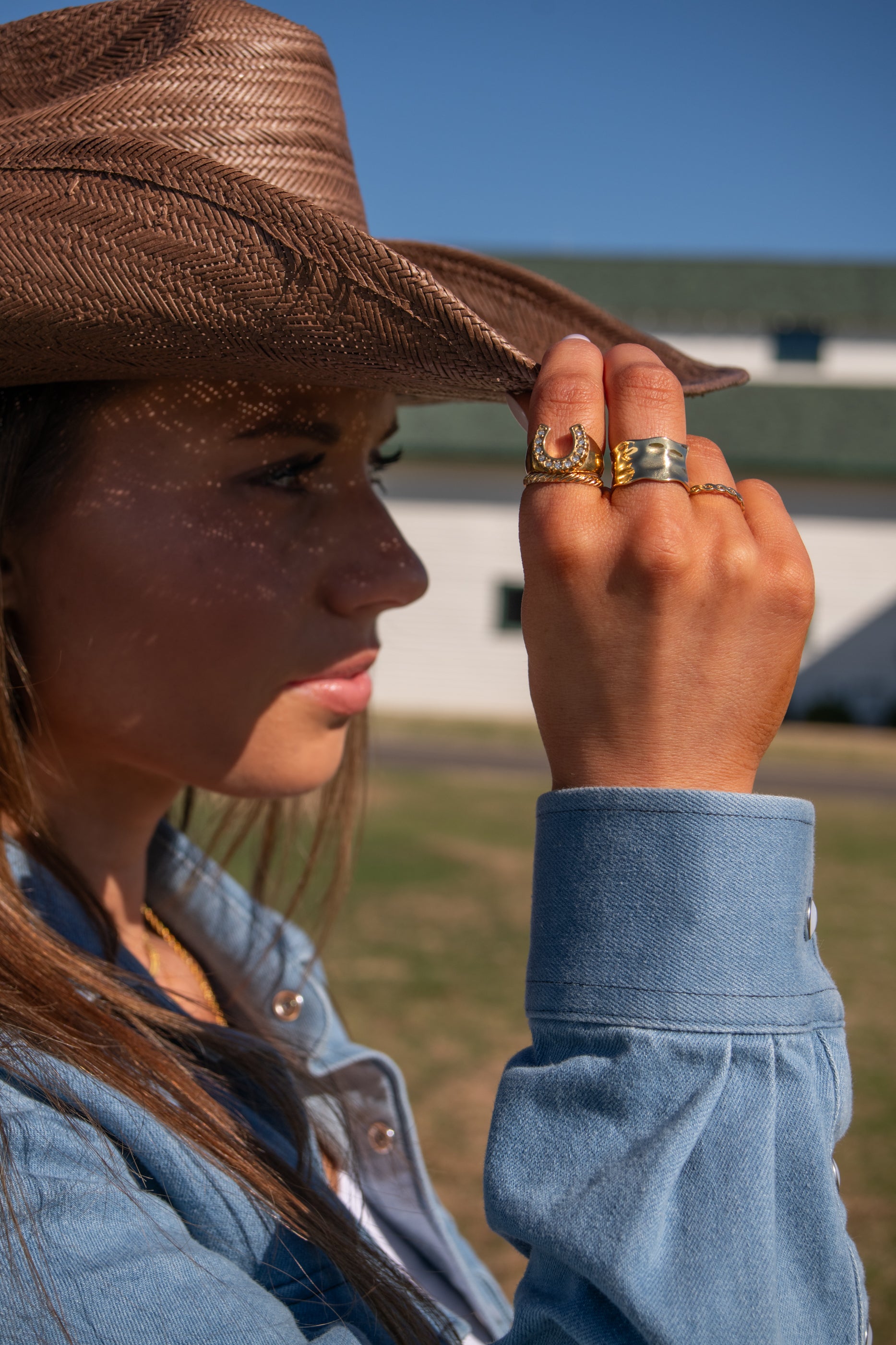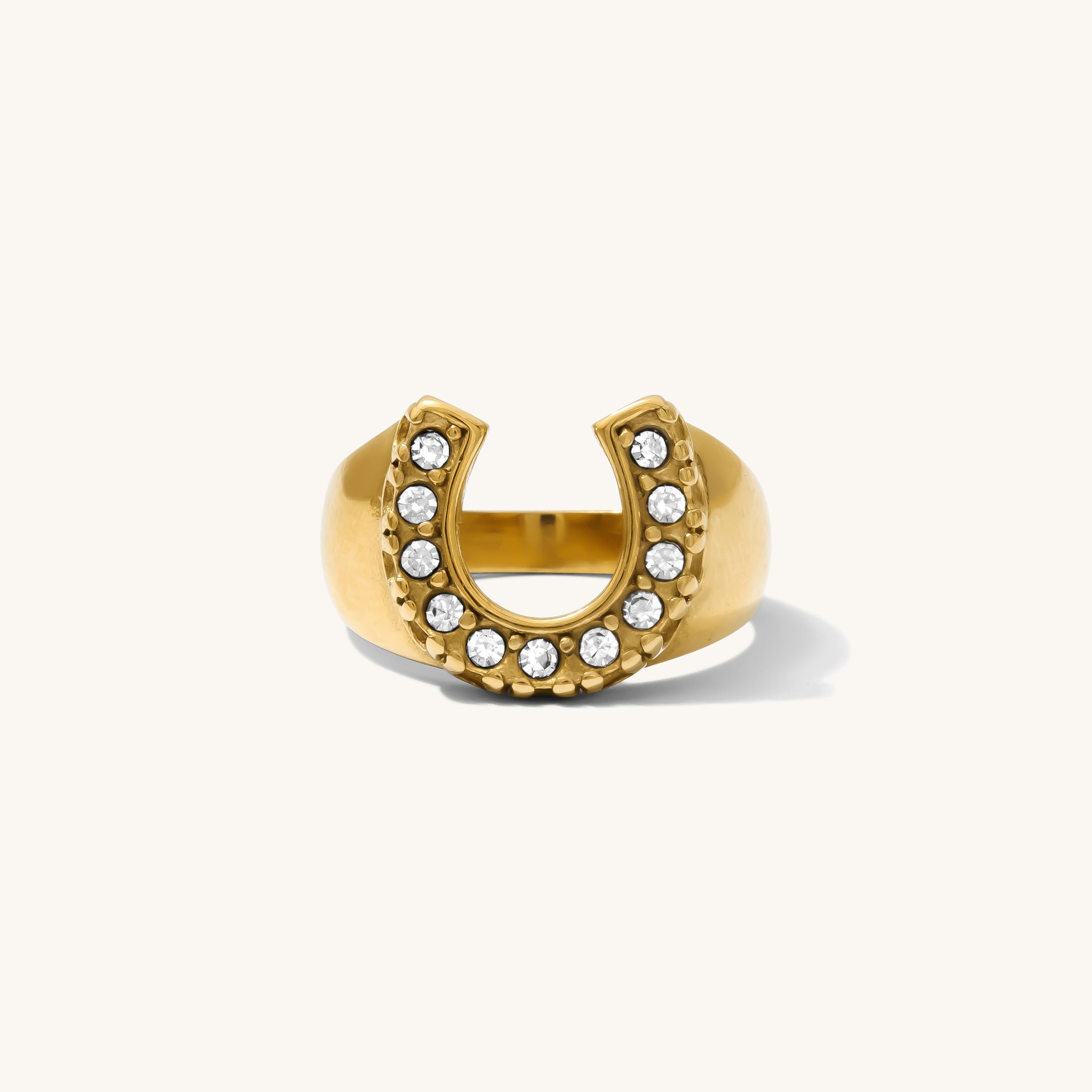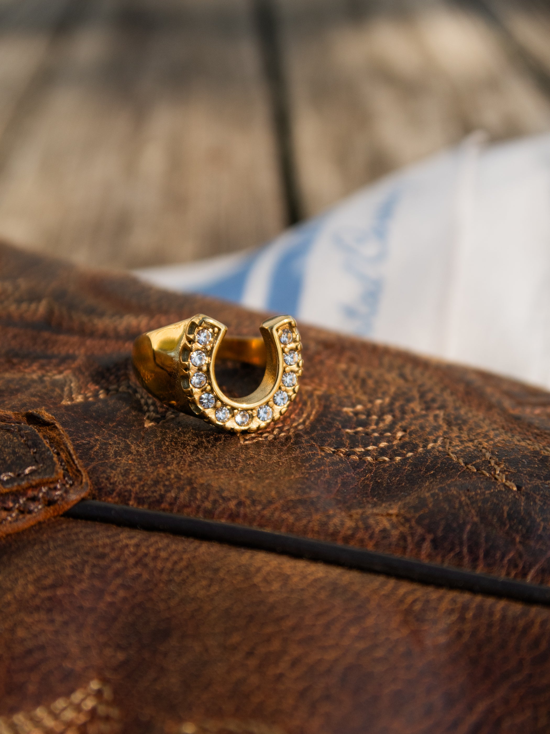 Your lucky charm—turned all the way up. The Nashville Horseshoe Ring is our statement rendition of a classic luck token, featuring a sculptural gold silhouette lined with light-catching stones. A ring that feels and looks like a vintage treasure, but crafted with materials that will last.—made to stand out from golden hour to last call.