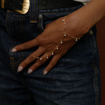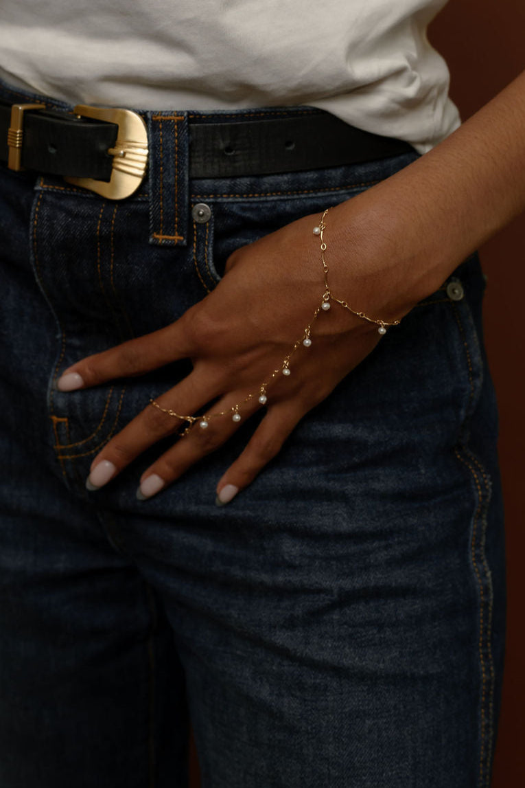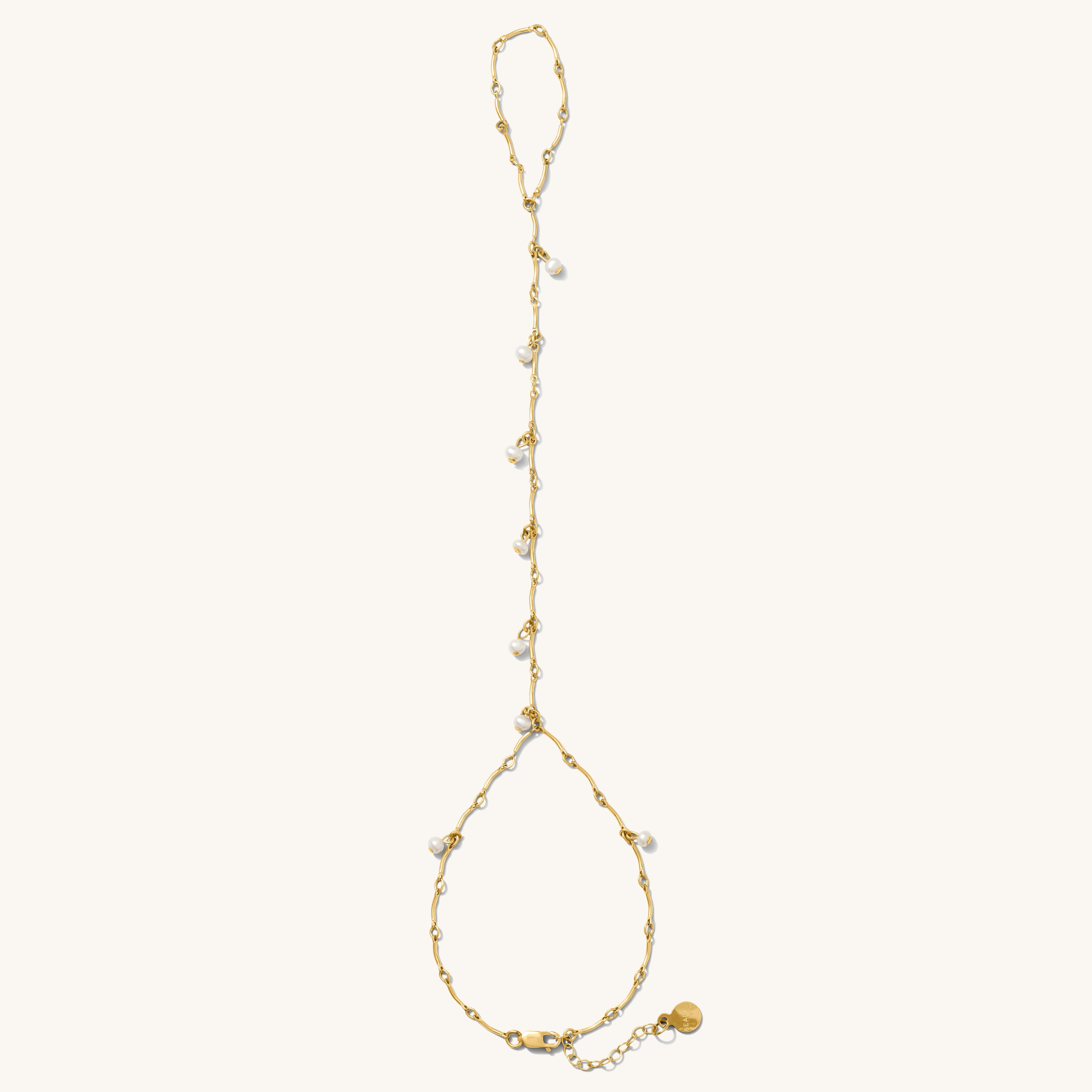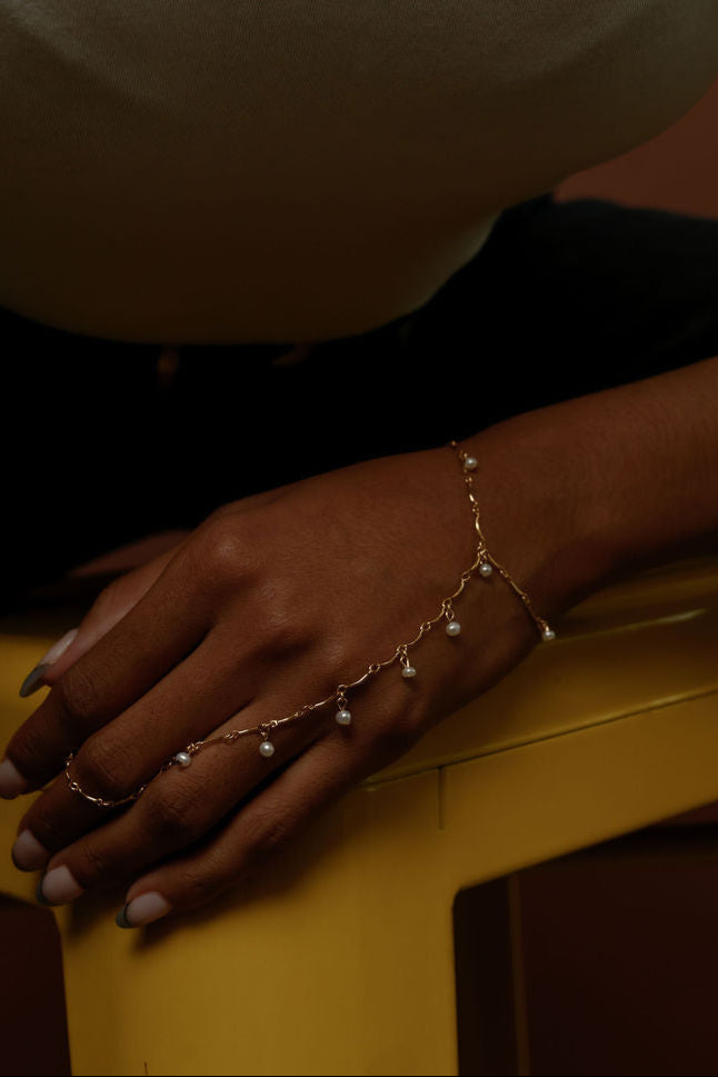 The Cascada hand chain showcases beauty in the little details. With a uniquely textured chain containing pearls dangling off both the bracelet and thad the chain, this piece is made to glow and glimmer.