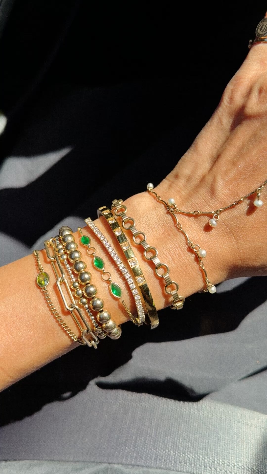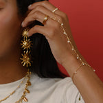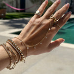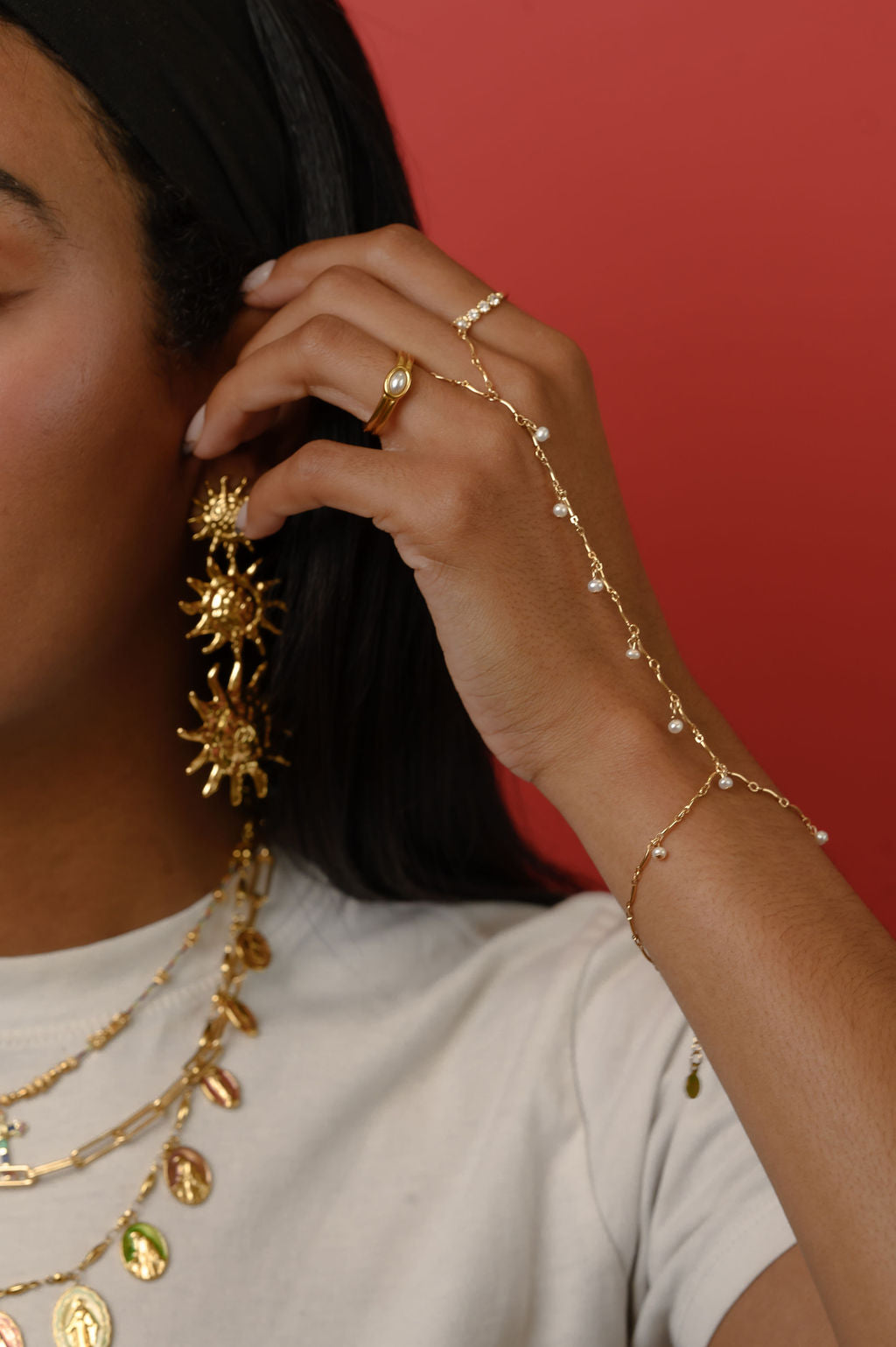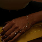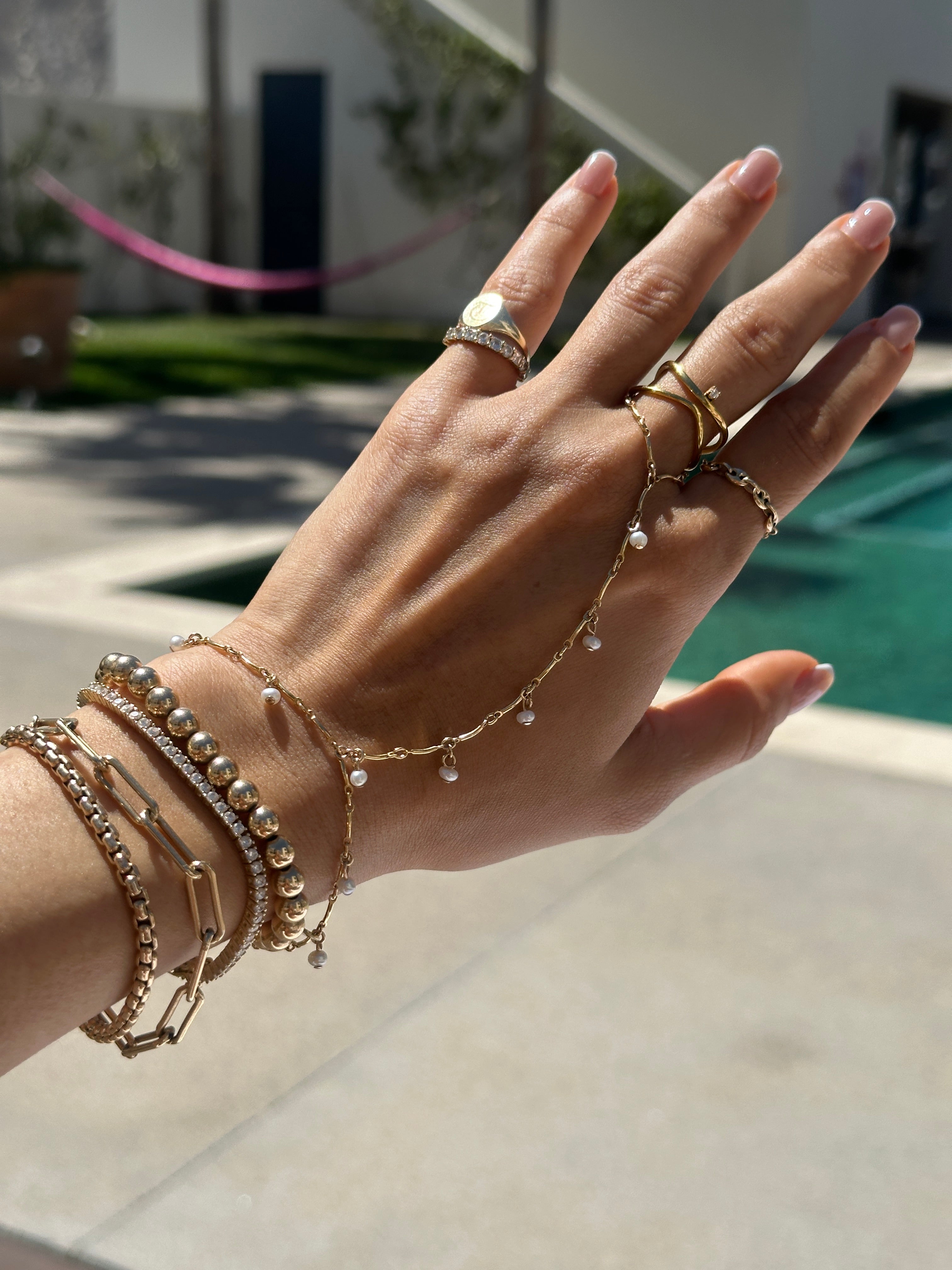 The Cascada hand chain showcases beauty in the little details. With a uniquely textured chain containing pearls dangling off both the bracelet and thad the chain, this piece is made to glow and glimmer.