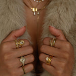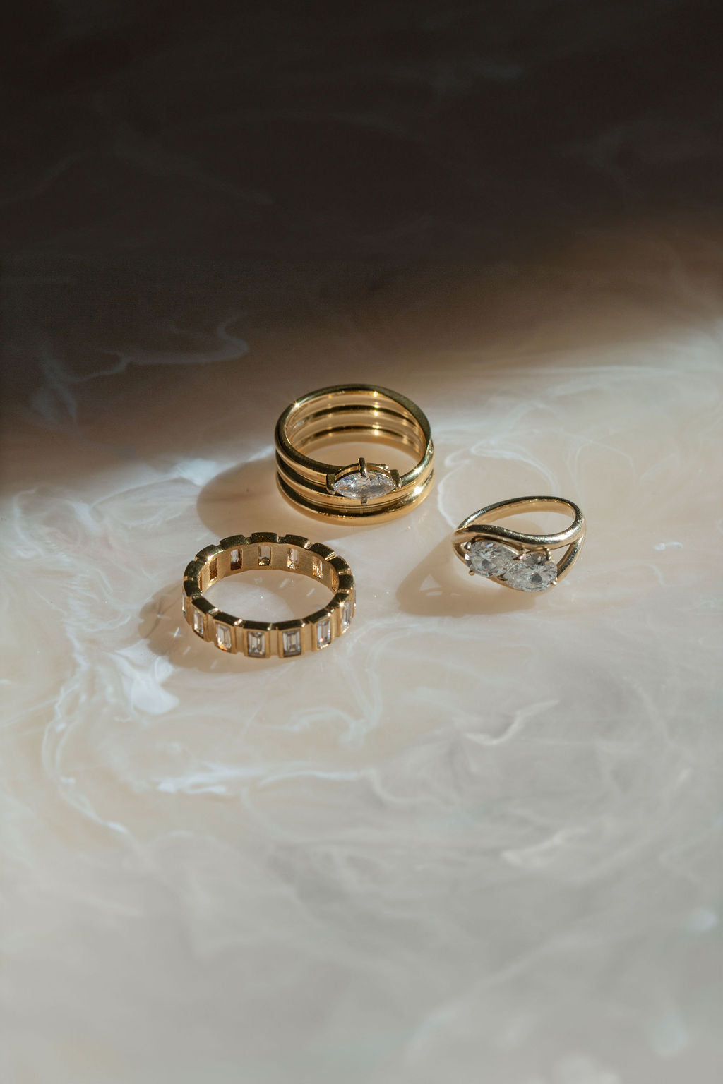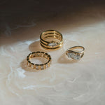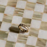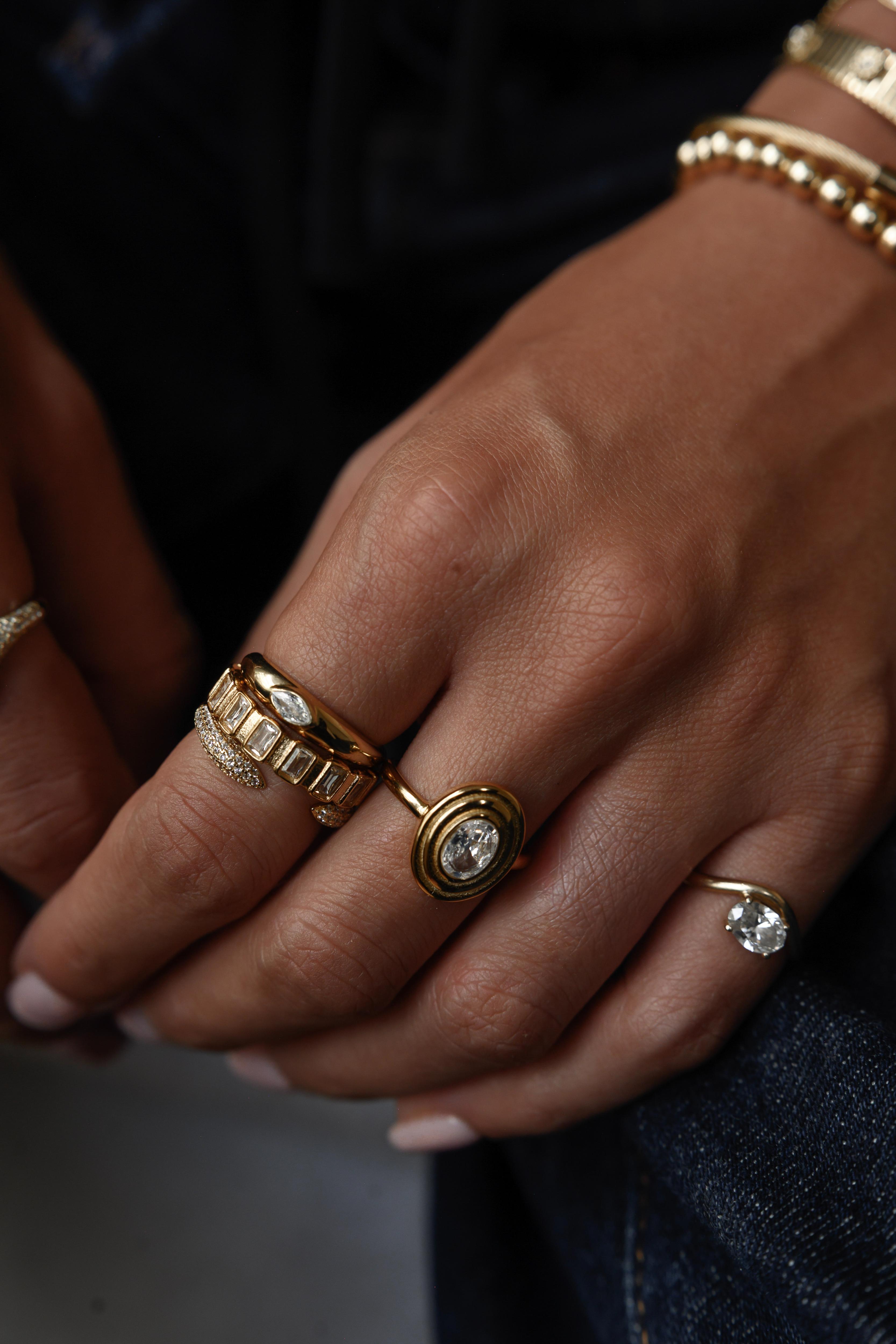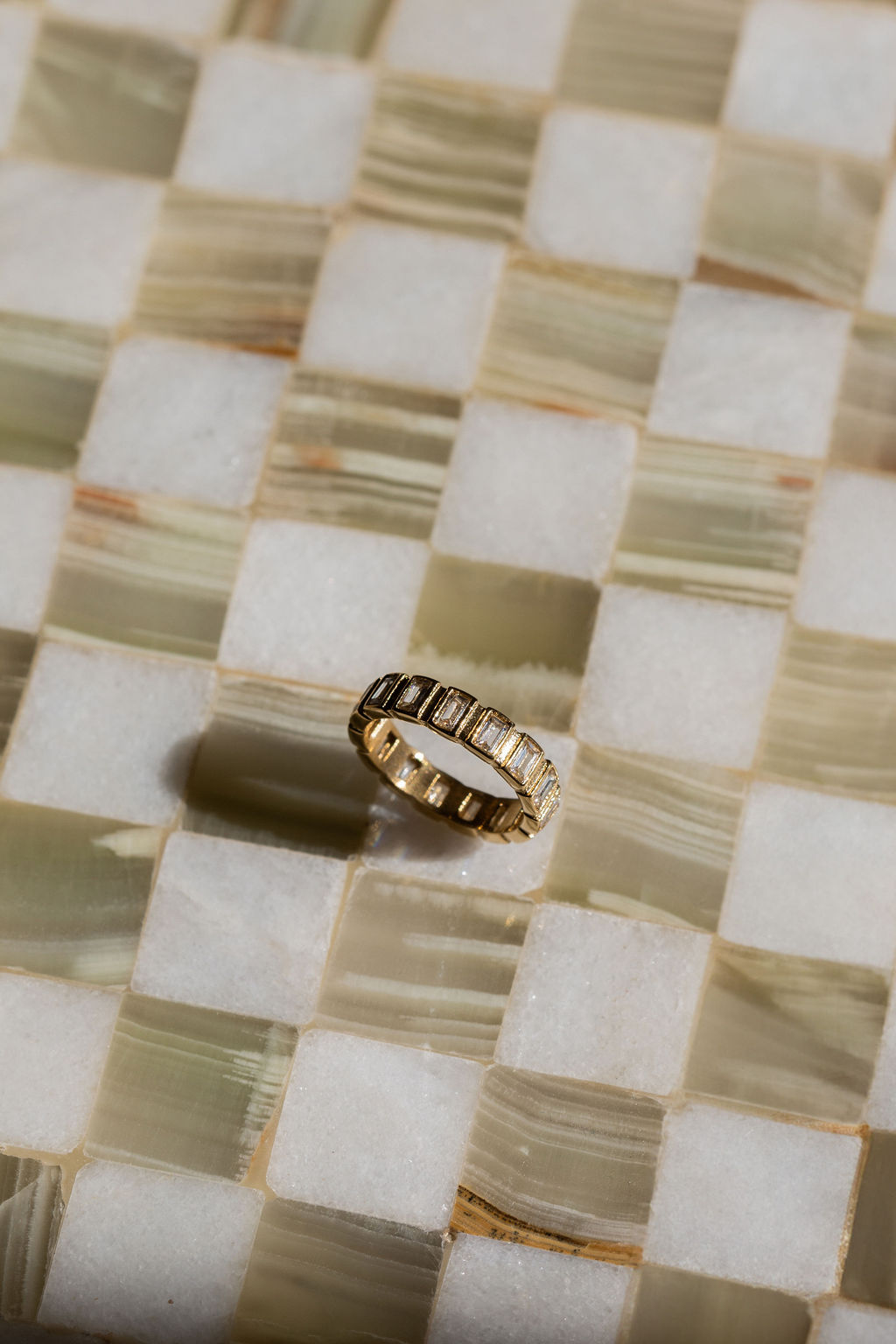 A bold ring with vintage undertones. Each stone in the Baguette Eternity ring alternates with a gold frame, making this a ring that mimics a fine-jewelry staple, without the fine-jewelry markup.
