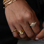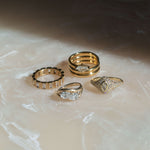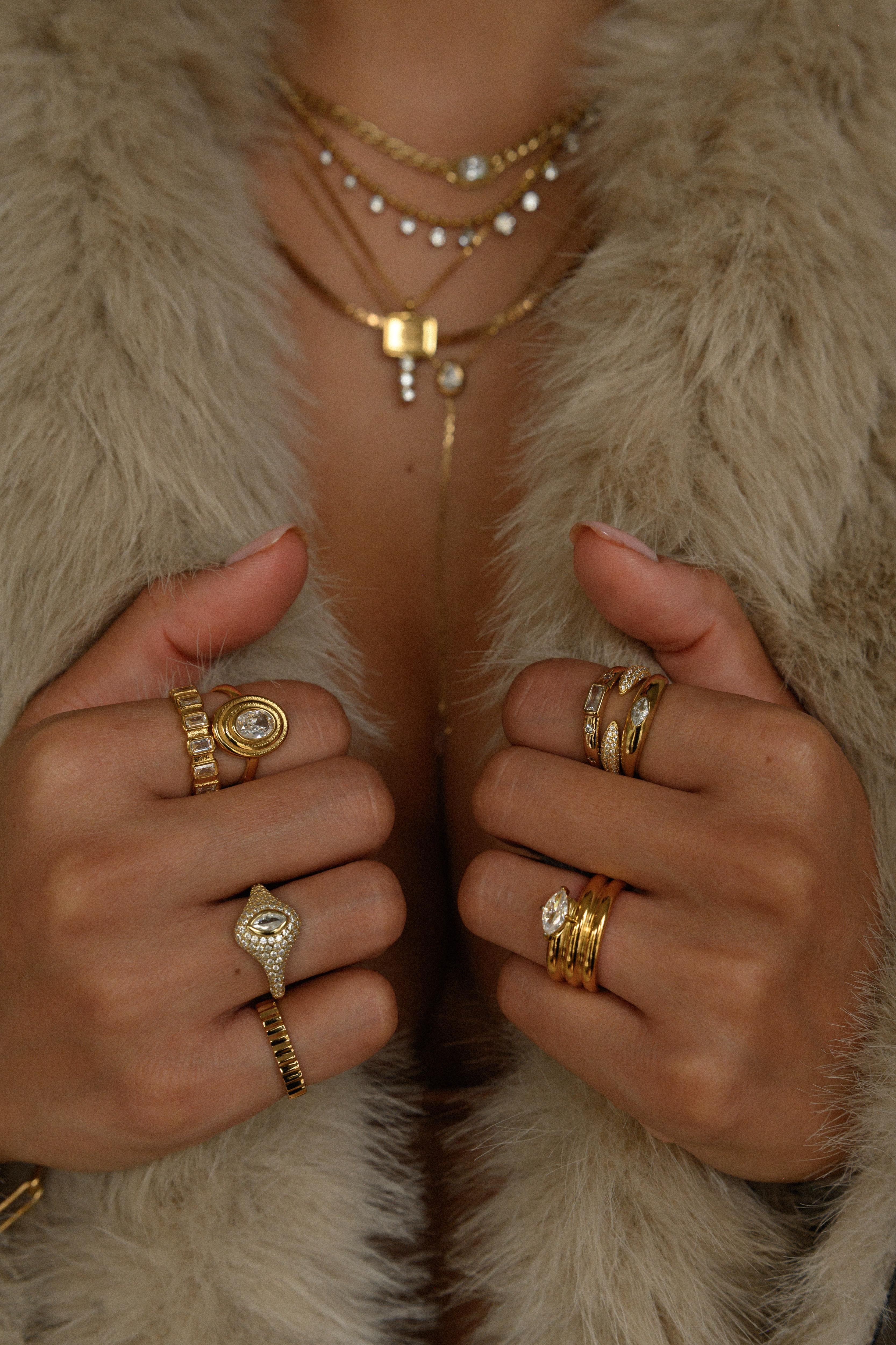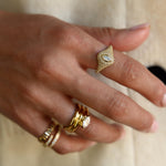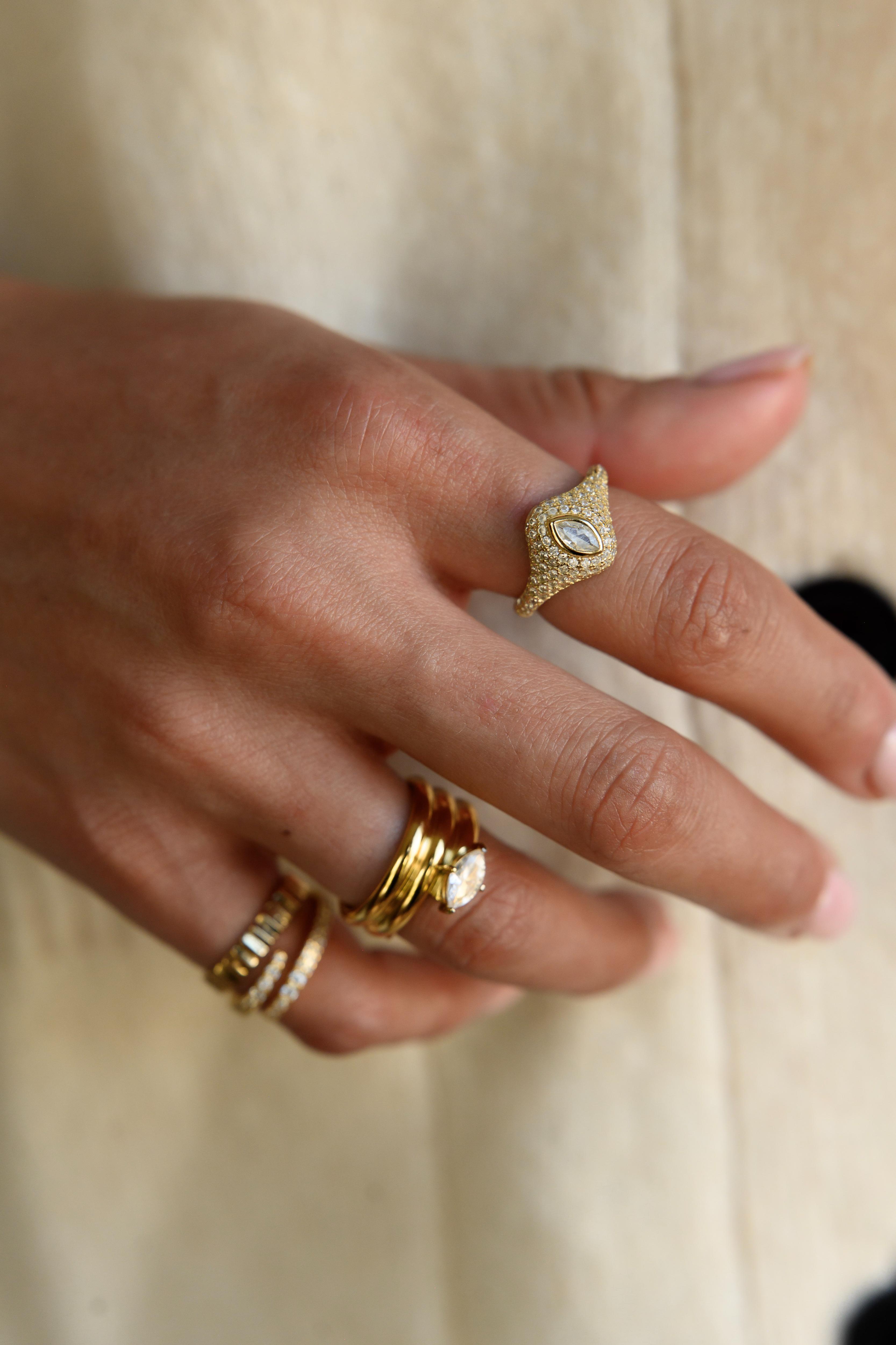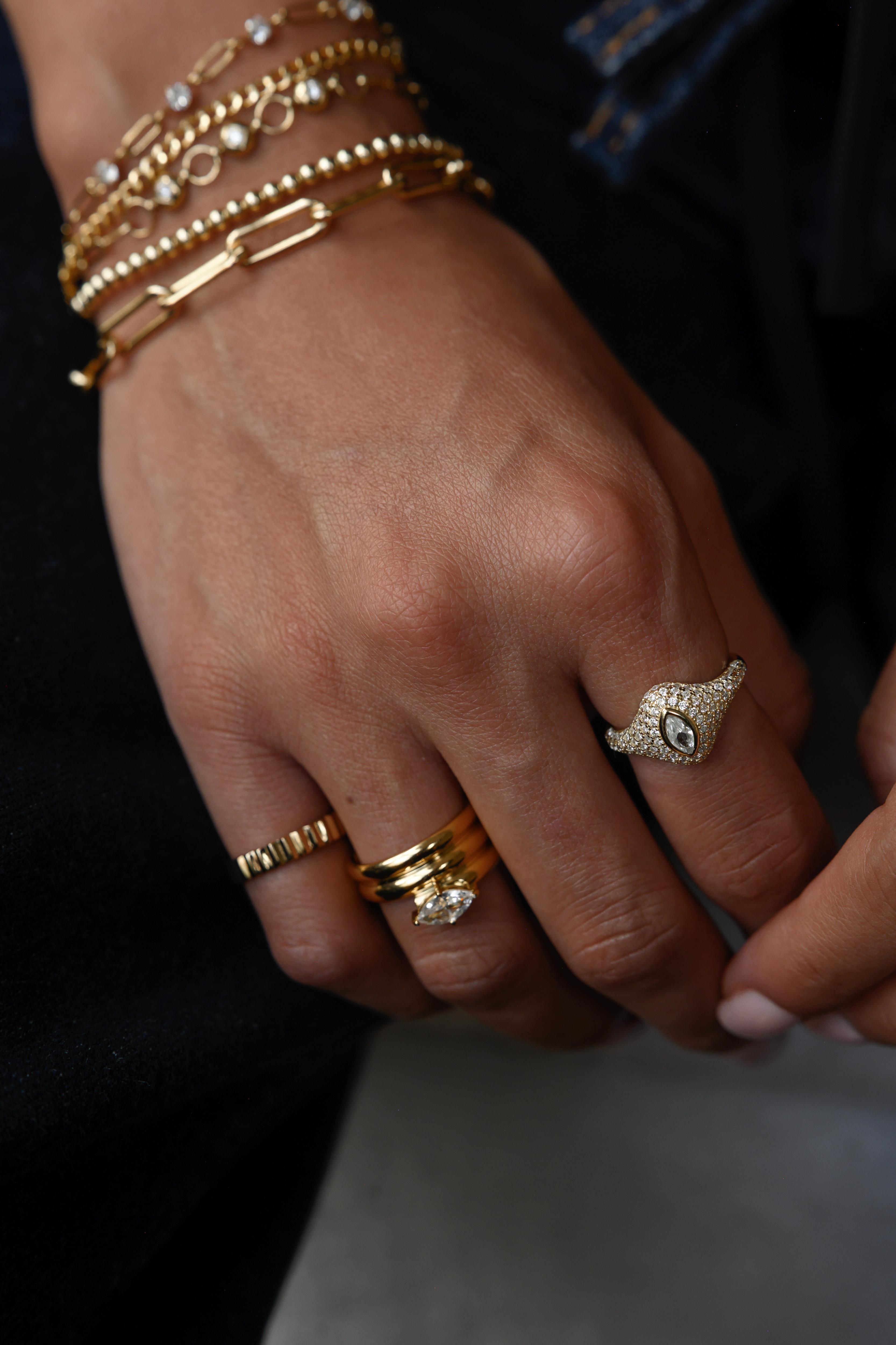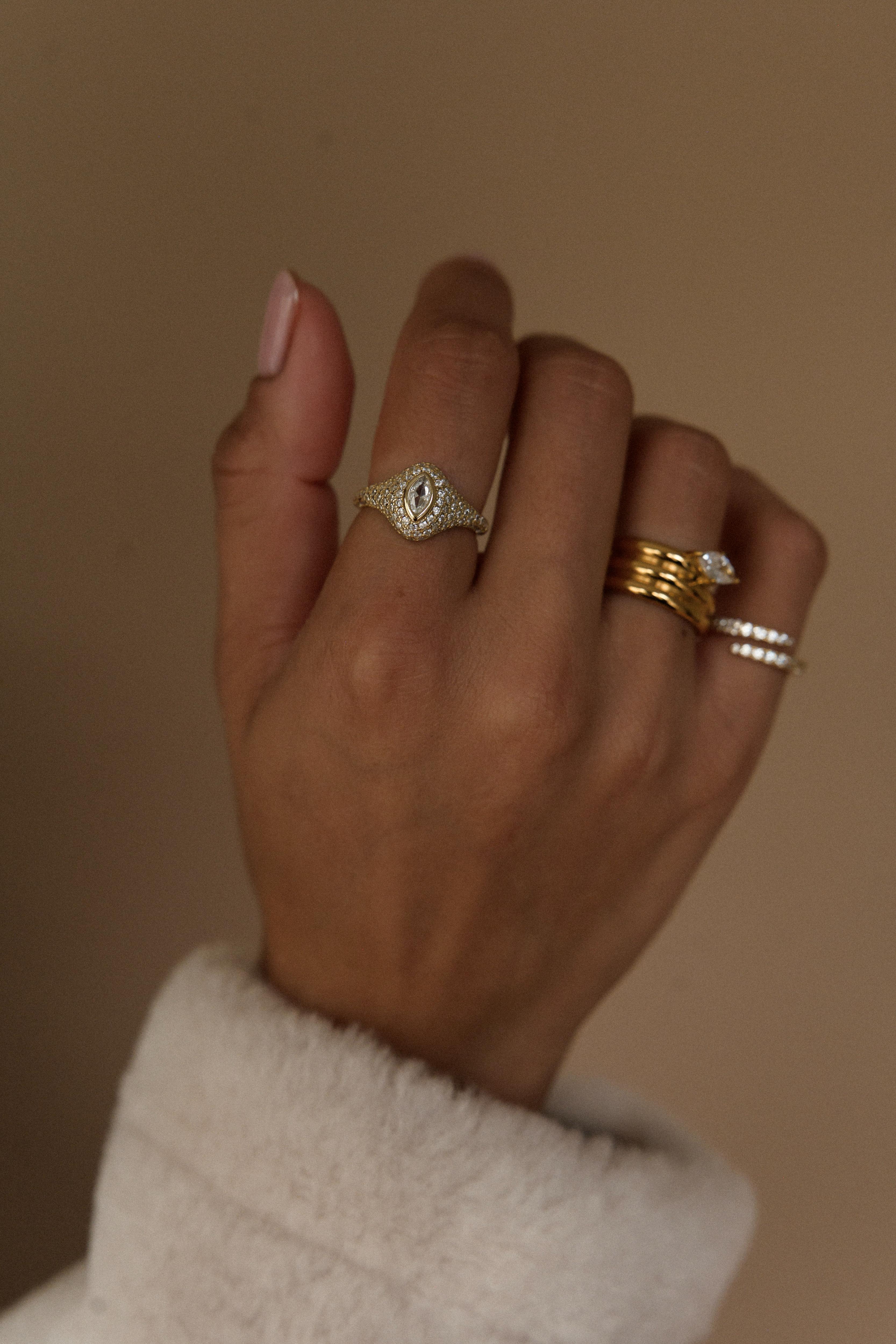 An eye-catching silhouette that feels like it’s from another era. The pavé signet ring features a marquise-cut center framed by dozens of tiny CZs for a soft, diamond-like glow. An ode to the classic pinky ring that's vintage in spirit, but styled for now.