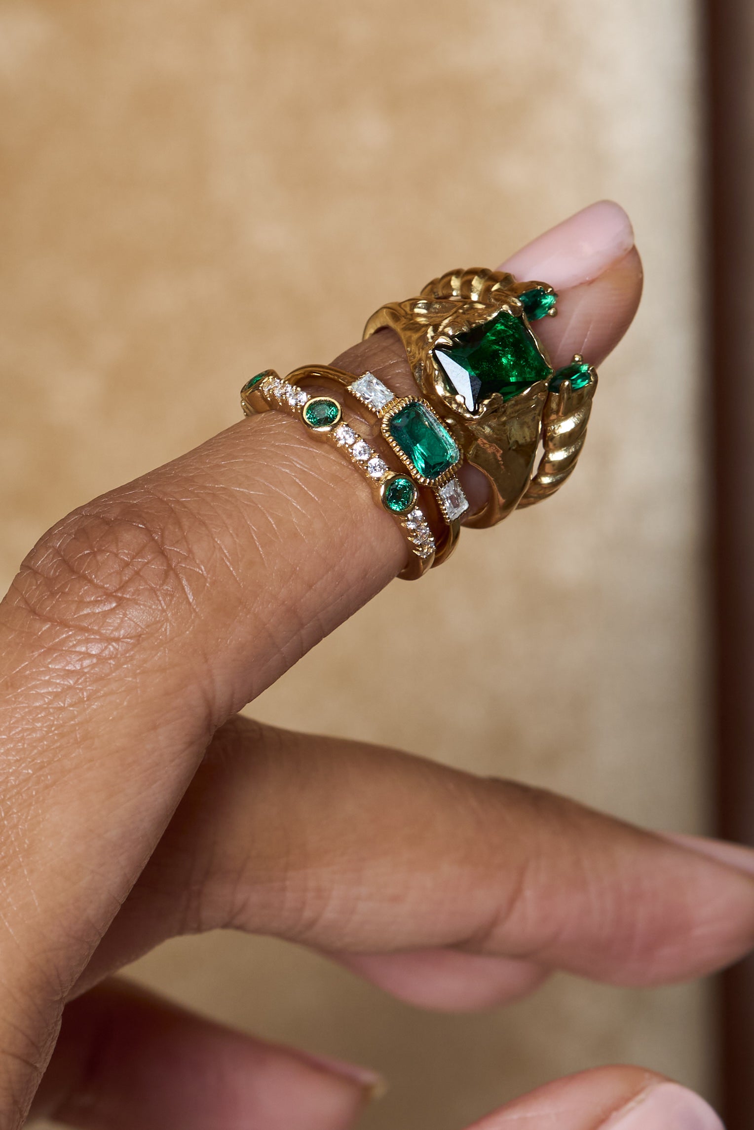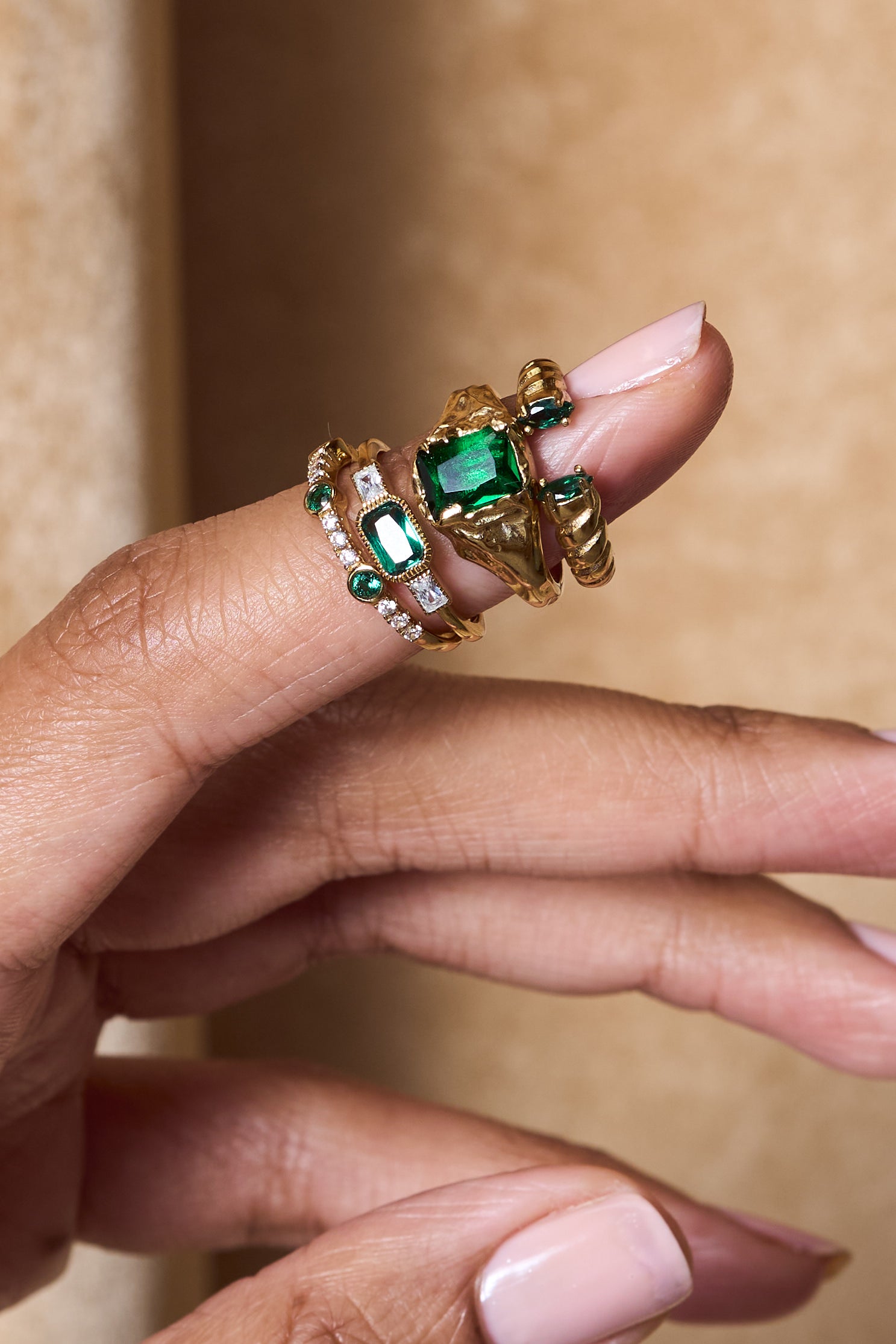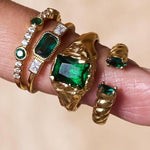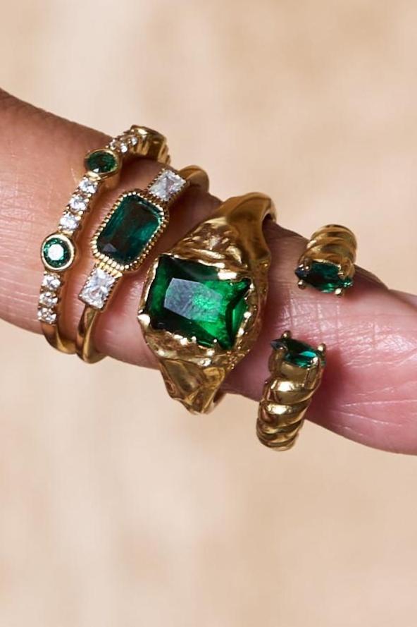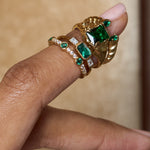 The Roman Ring is an open cuff ring with emerald stones accenting the opening. This piece wraps around the finger in a unique way we're sure you won't find anywhere else. Grab our matching Roman Ring in onyx for a different vibe.