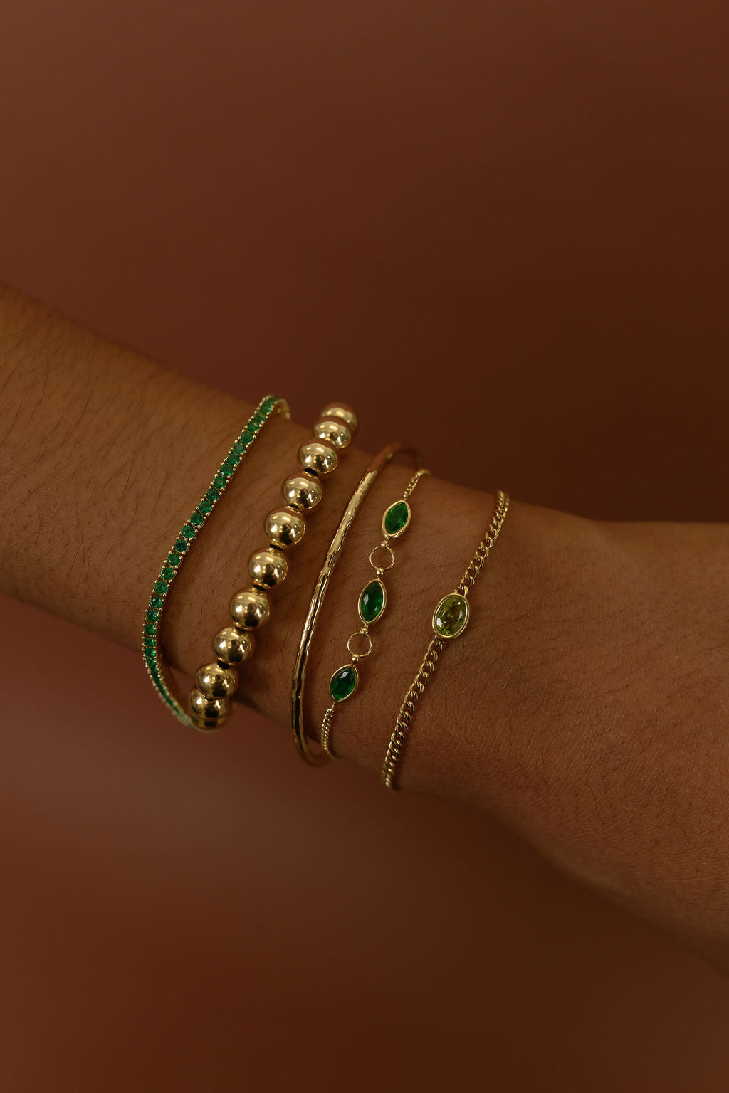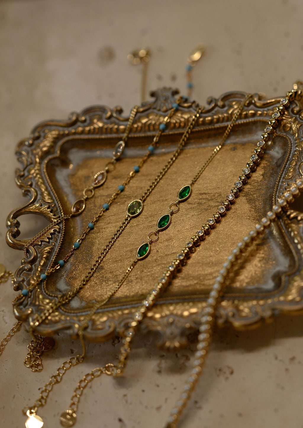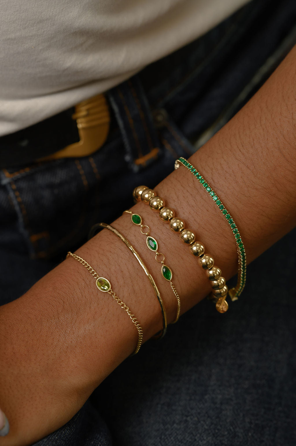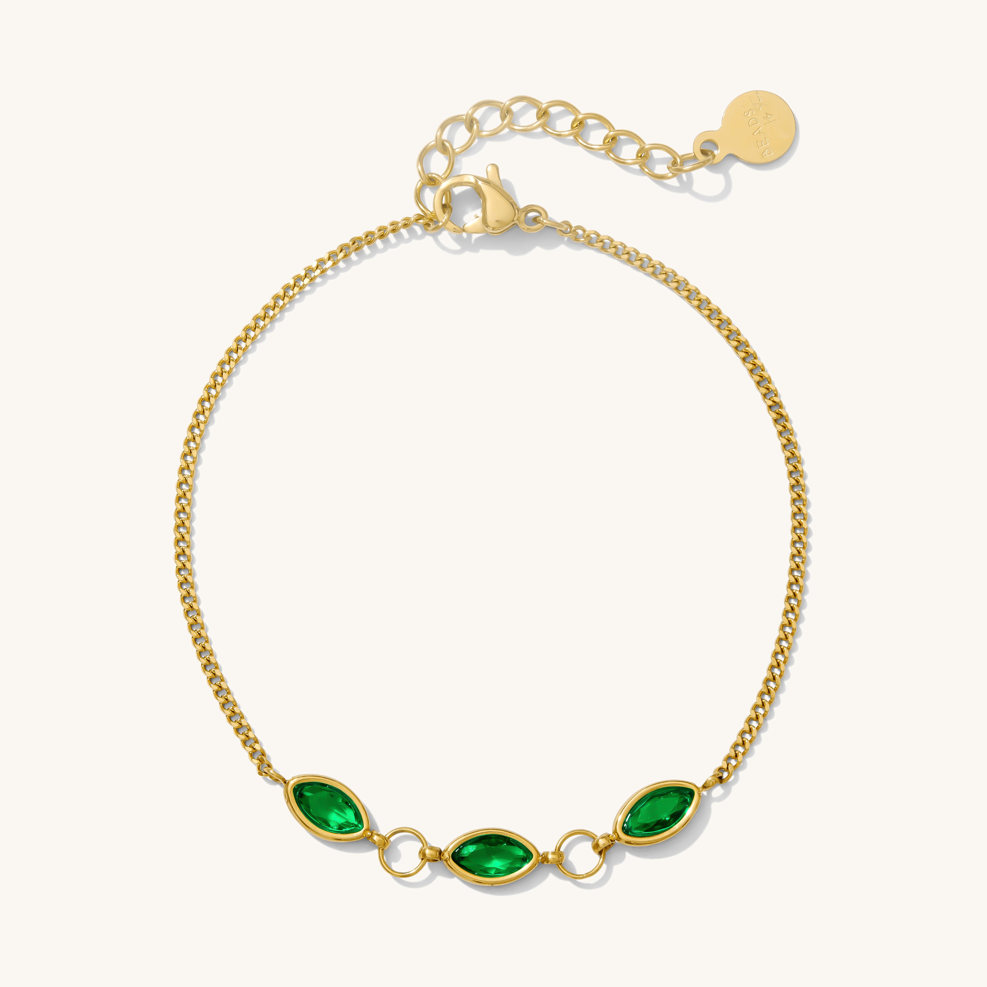 Paying homage to the trend in marquise stones, the Emerald Marquise bracelet is flowy, fun, and effortless. Three emerald stones sit spaced apart by oversized gold hoops, with a dainty curb chain to tie it all together.