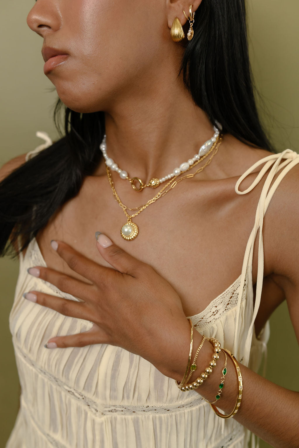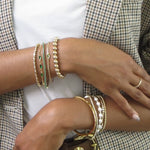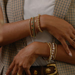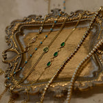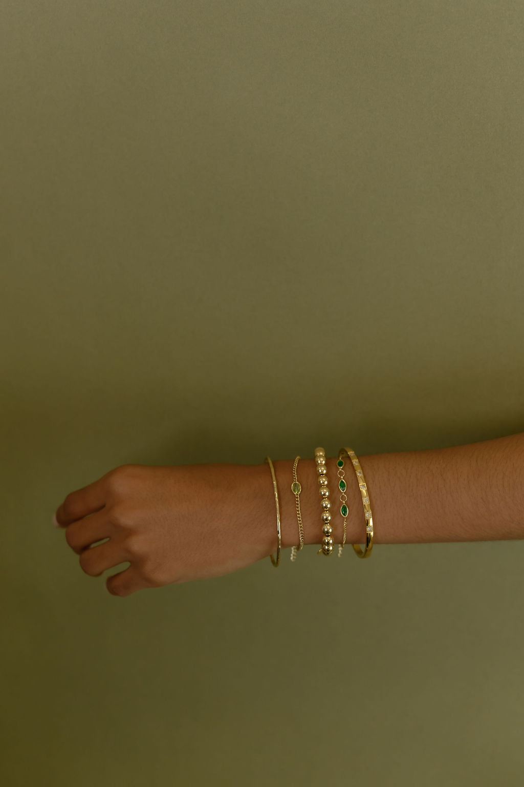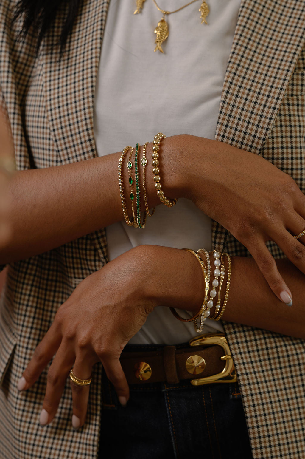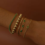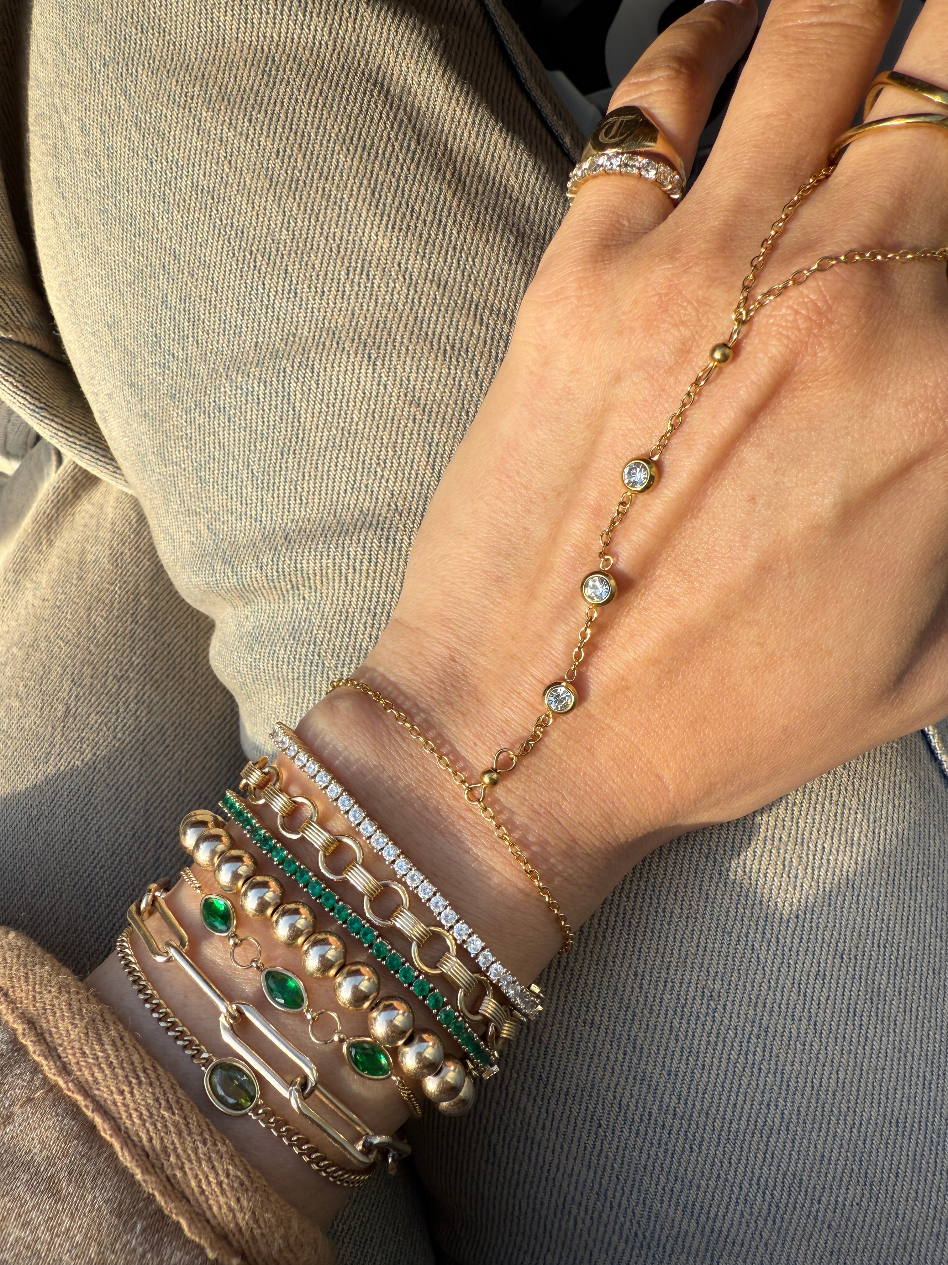 Paying homage to the trend in marquise stones, the Emerald Marquise bracelet is flowy, fun, and effortless. Three emerald stones sit spaced apart by oversized gold hoops, with a dainty curb chain to tie it all together.