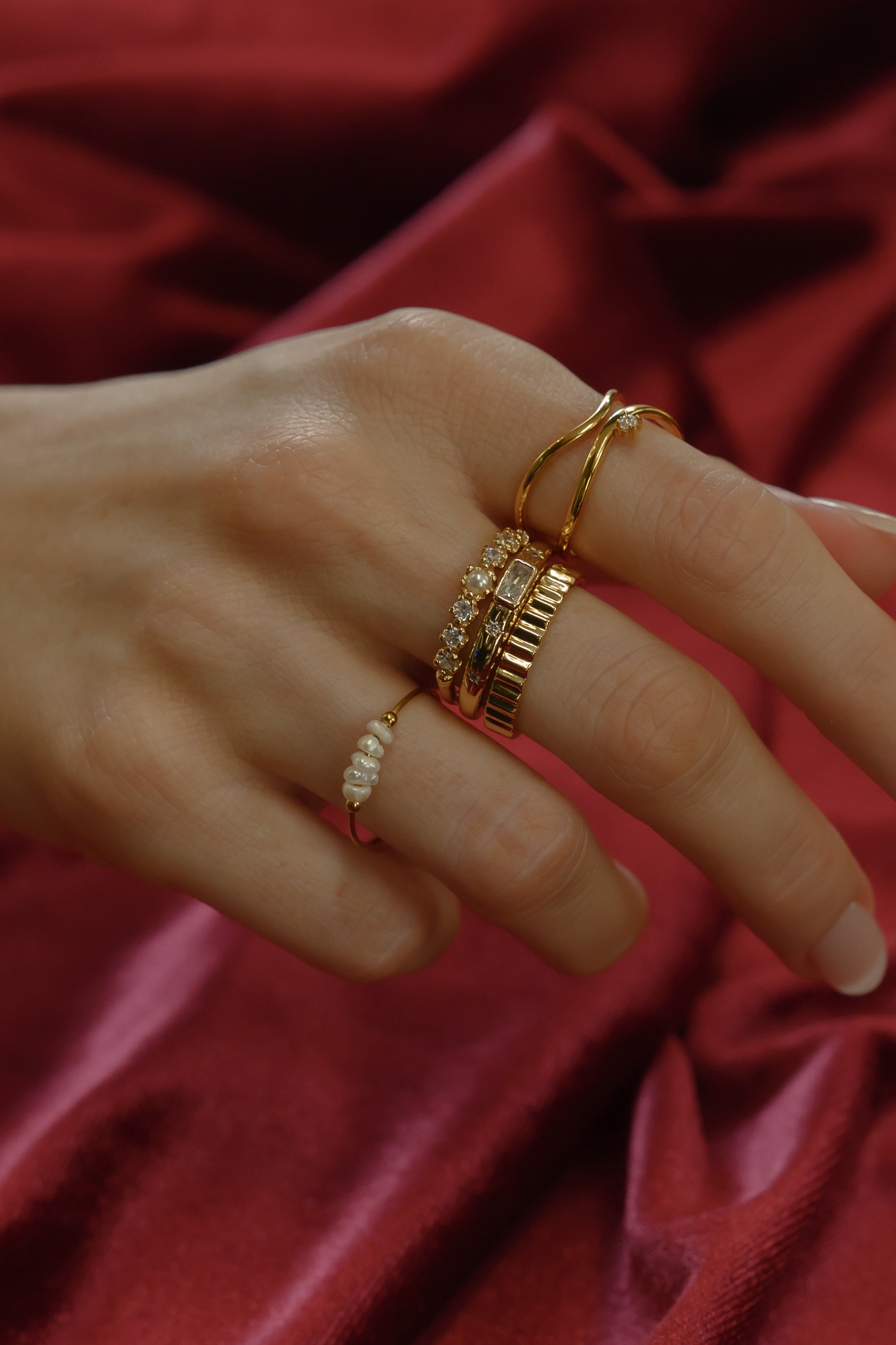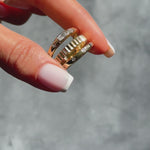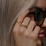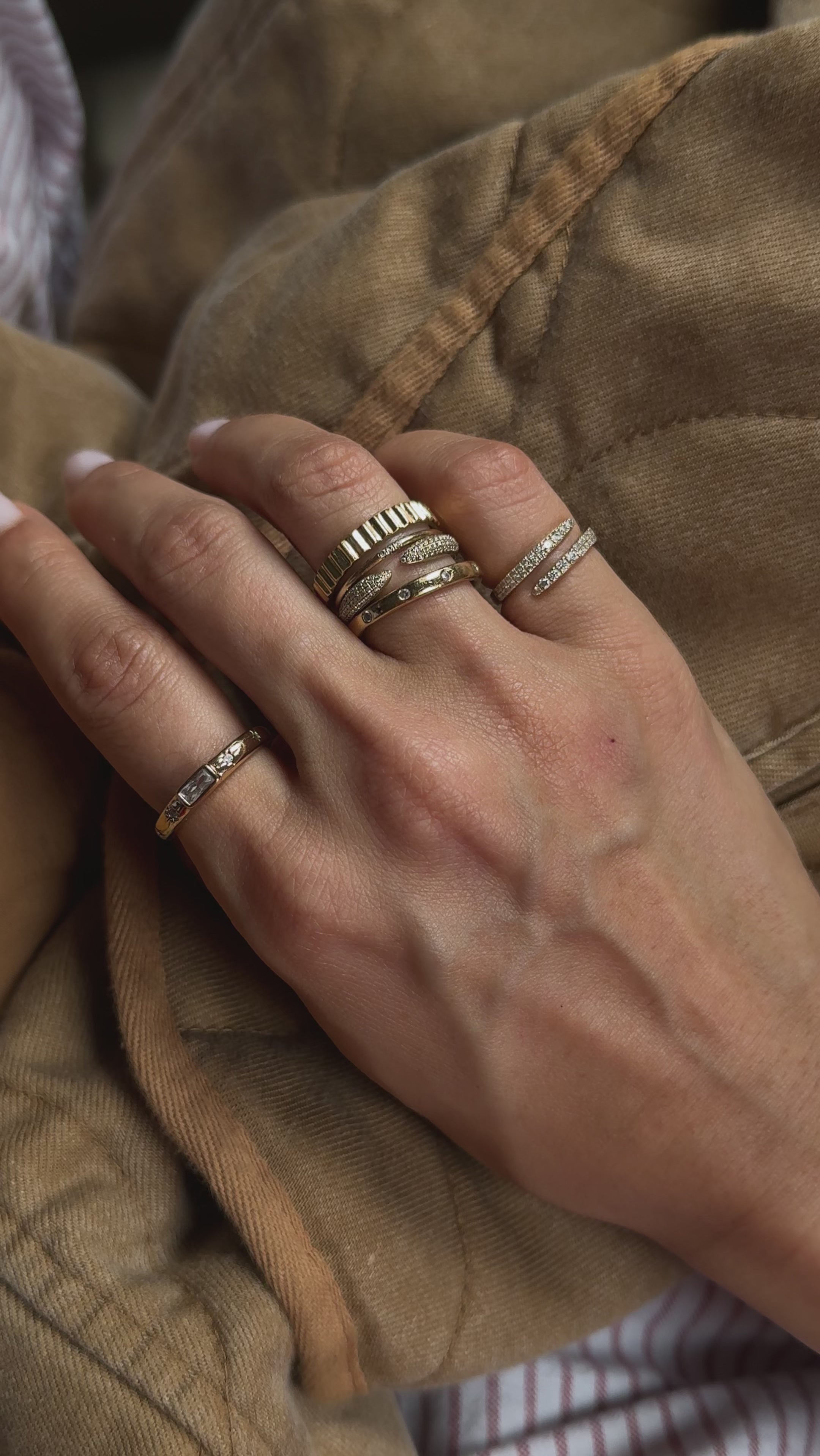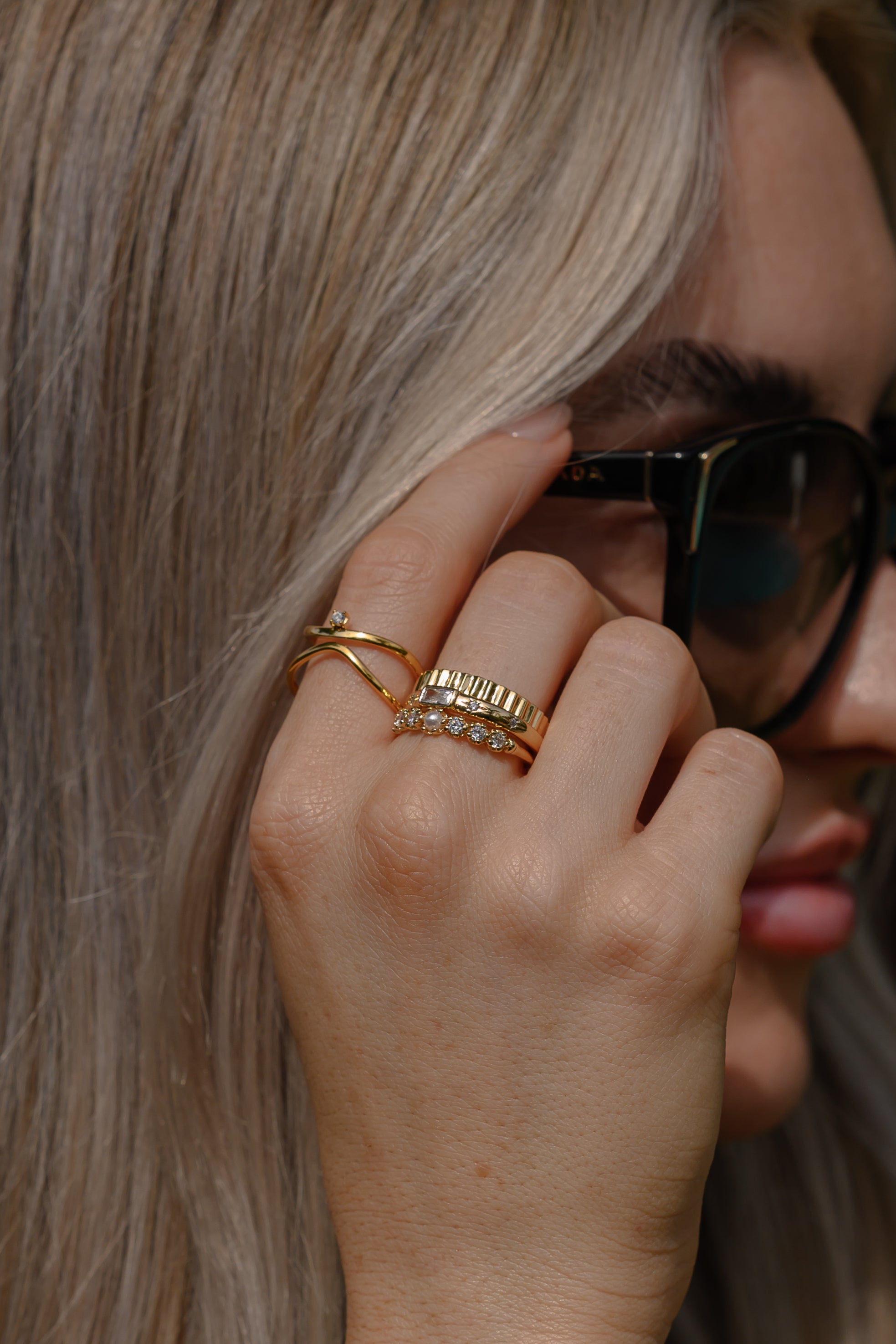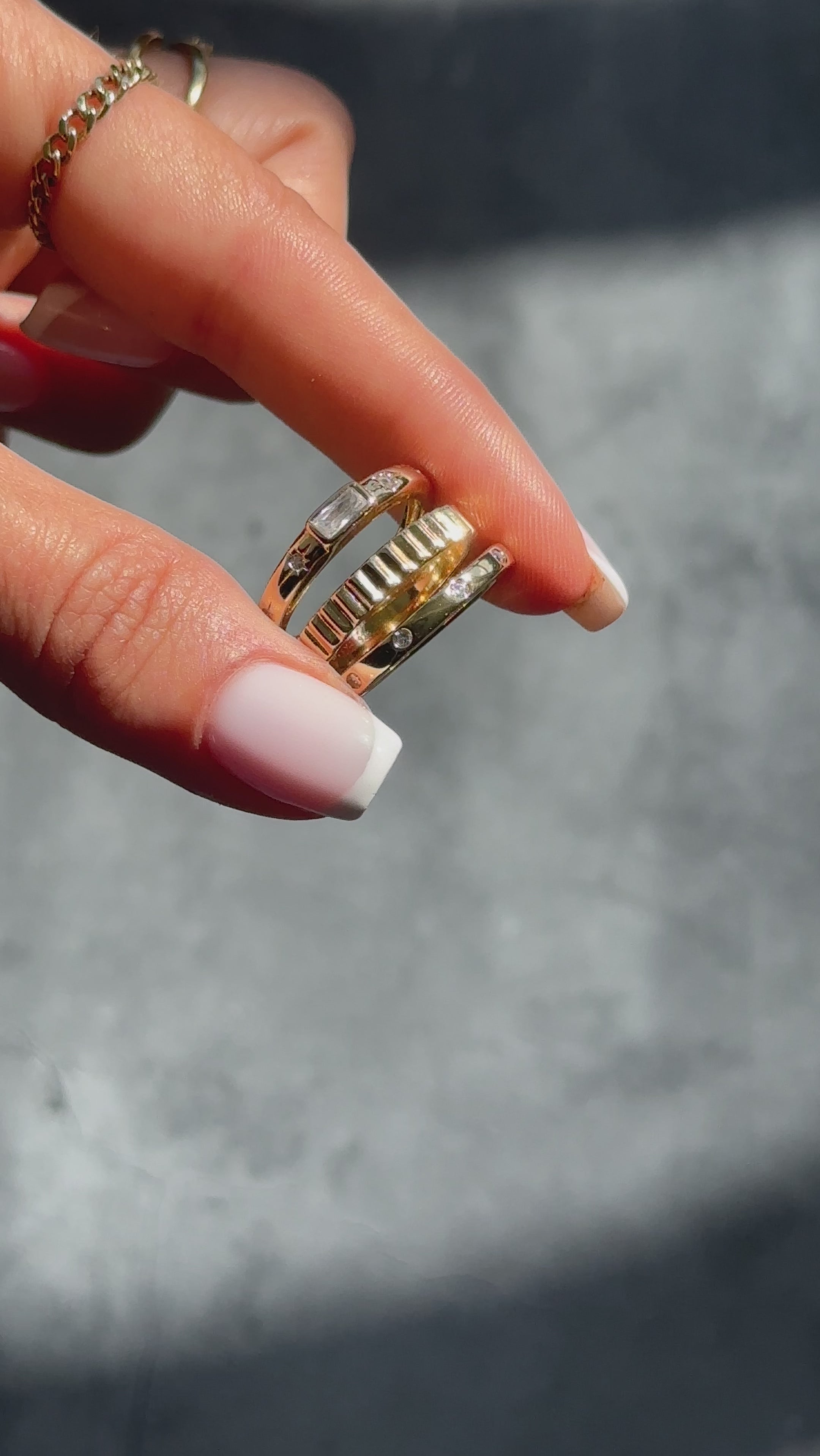 An east-west set emerald cut stone framed with a starburst motif, the Celeste Ring is as heavenly as the name implies. Wear it as a stacking ring or as an accent piece to an ethereal sparkle to your fingers.