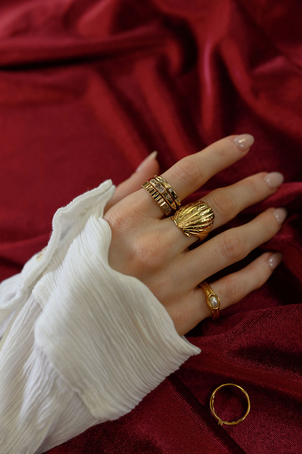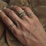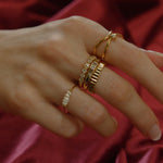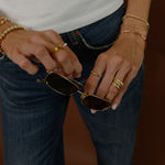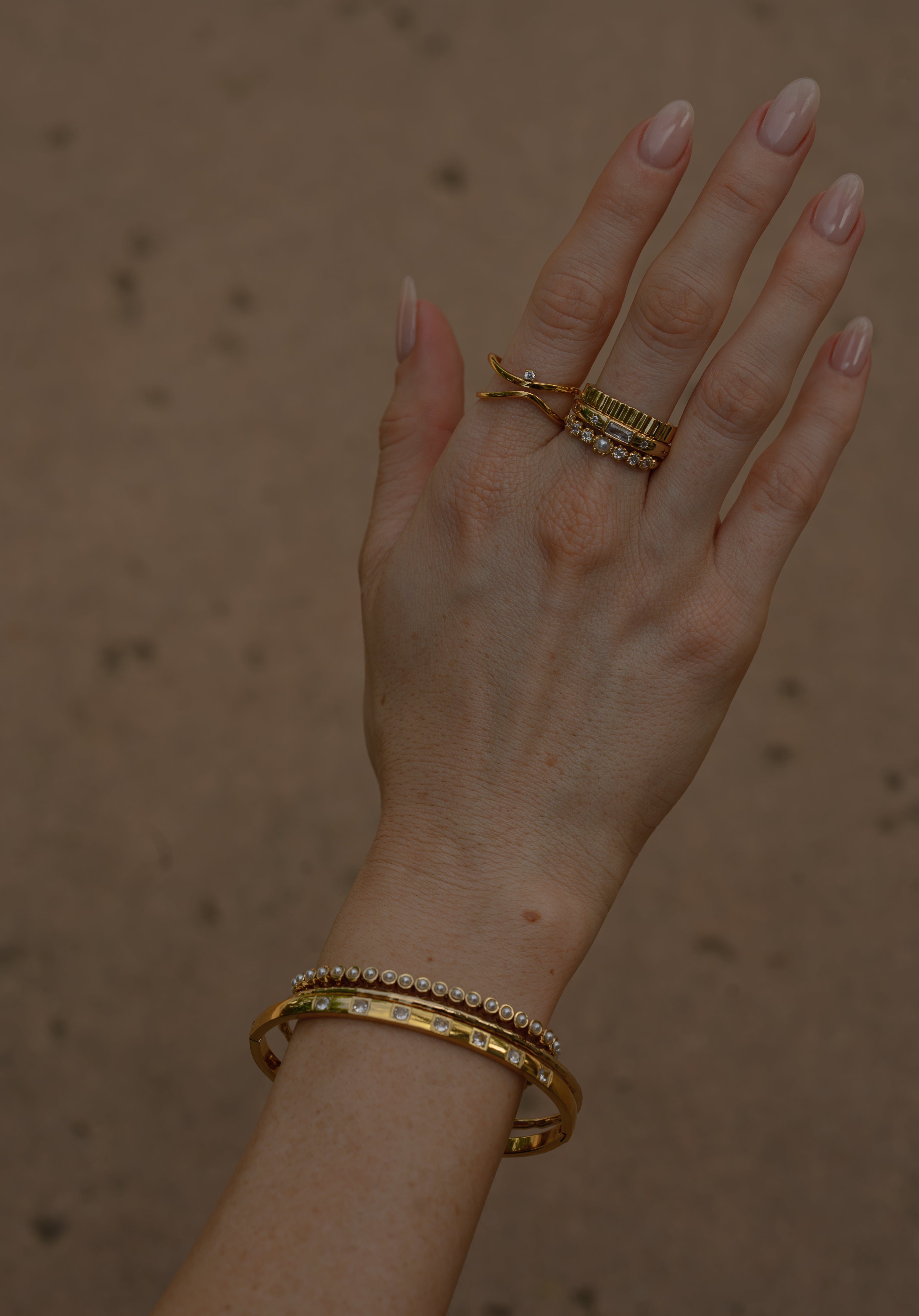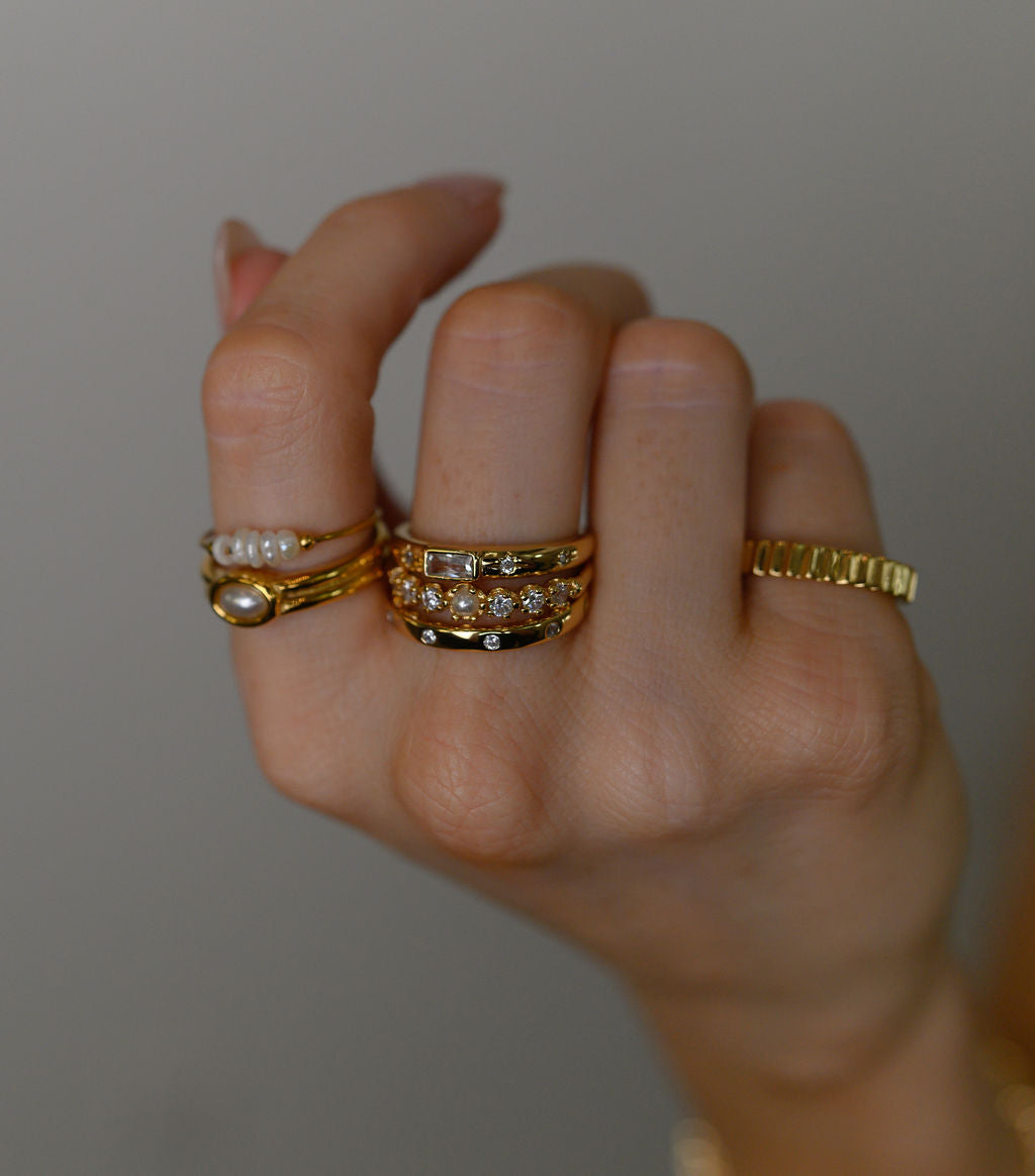 An east-west set emerald cut stone framed with a starburst motif, the Celeste Ring is as heavenly as the name implies. Wear it as a stacking ring or as an accent piece to an ethereal sparkle to your fingers.