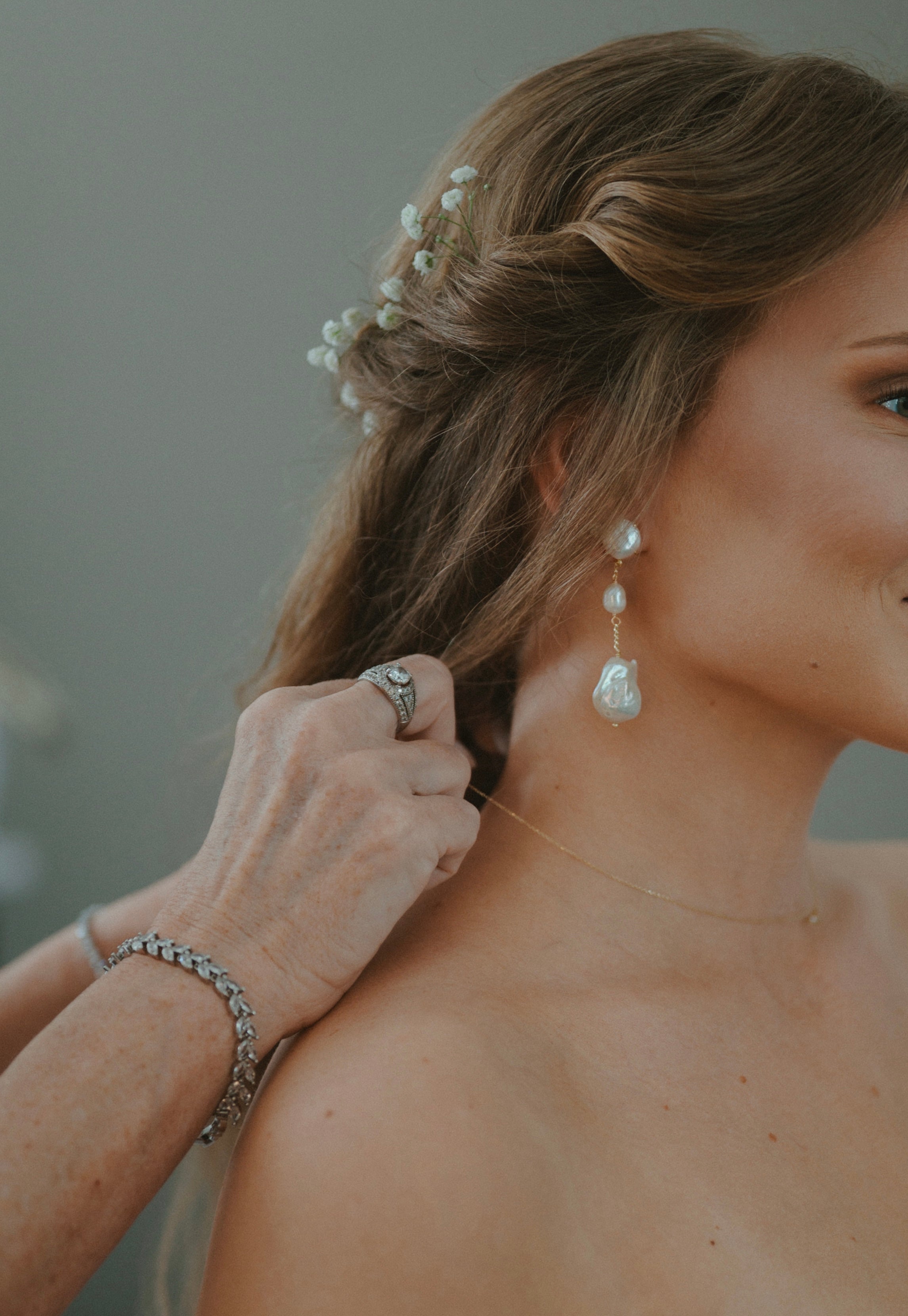 Ethereal, organic, and timeless are some words that come to mind when describing the Opaline earrings. Made with natural freshwater pearls, no two earrings are exactly same, making these statement pearl earrings perfect for any and all bridal events.