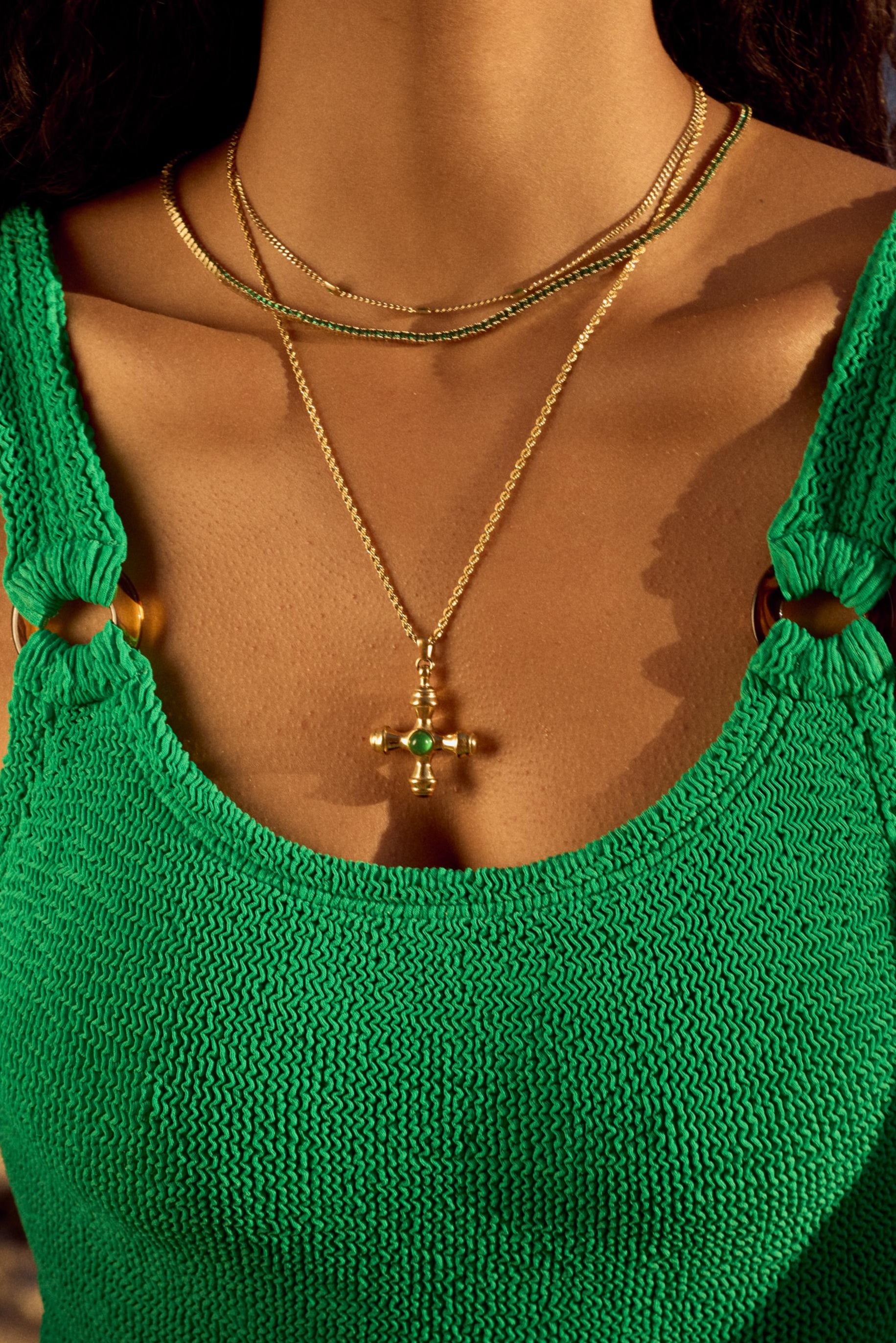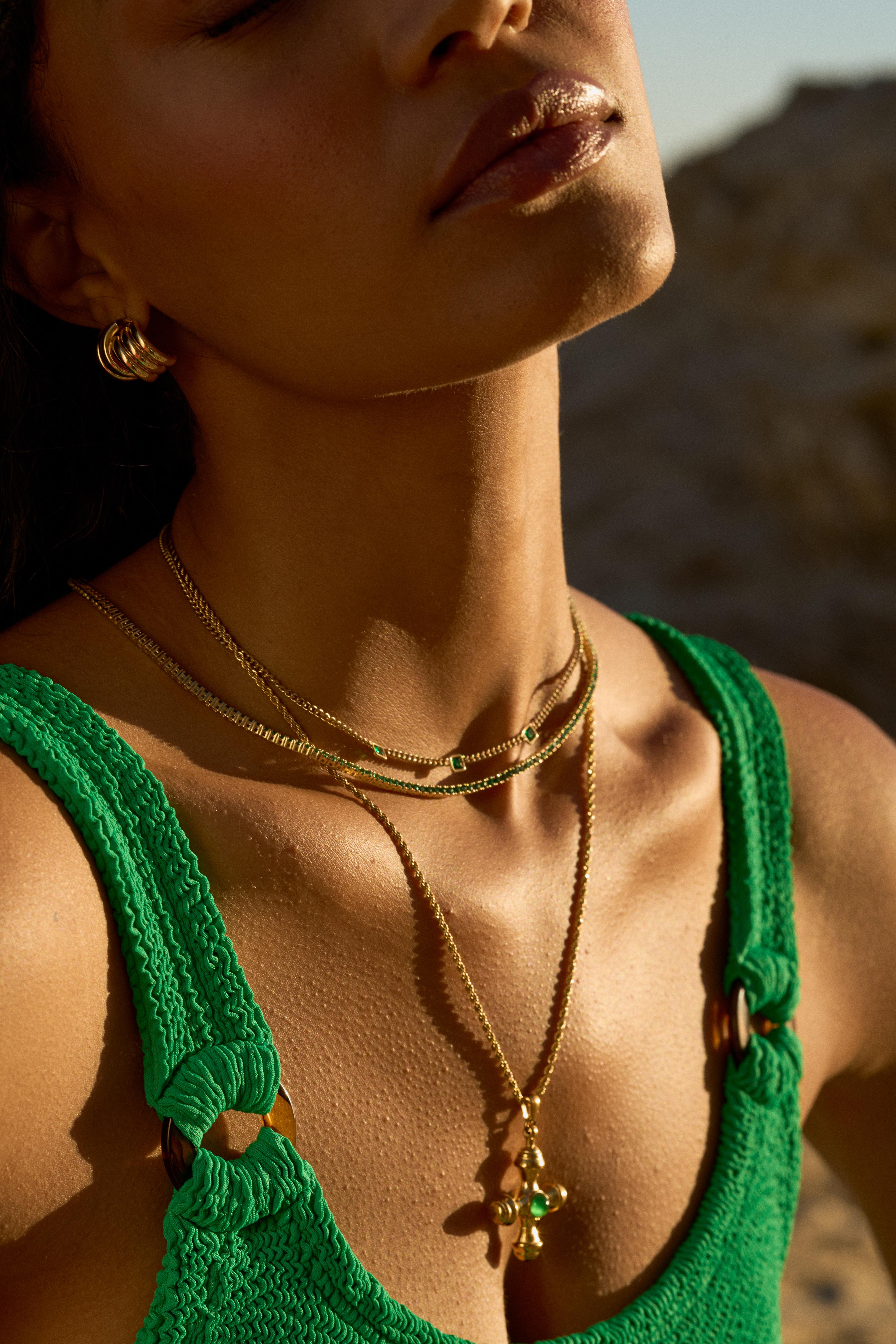 This funky, organic pendant set on an vintage-inspired rope chain features an emerald center stone, making the Dune necklace a staple layering piece one you'll rock all summer, long into other seasons.