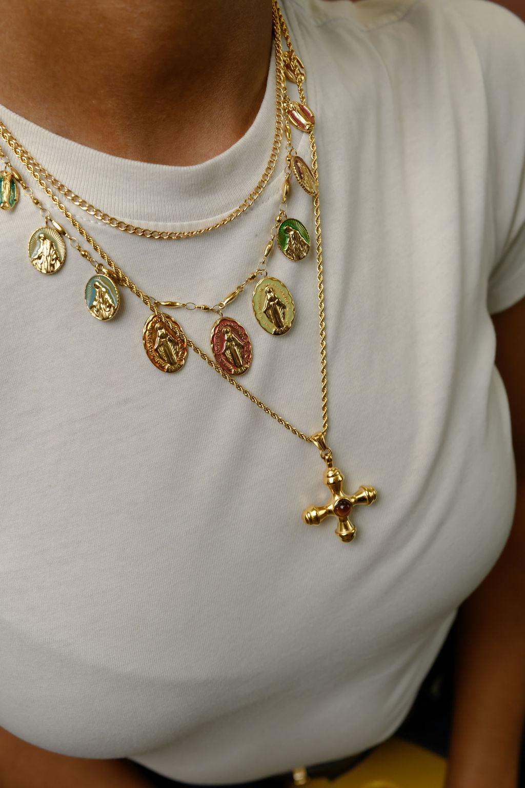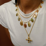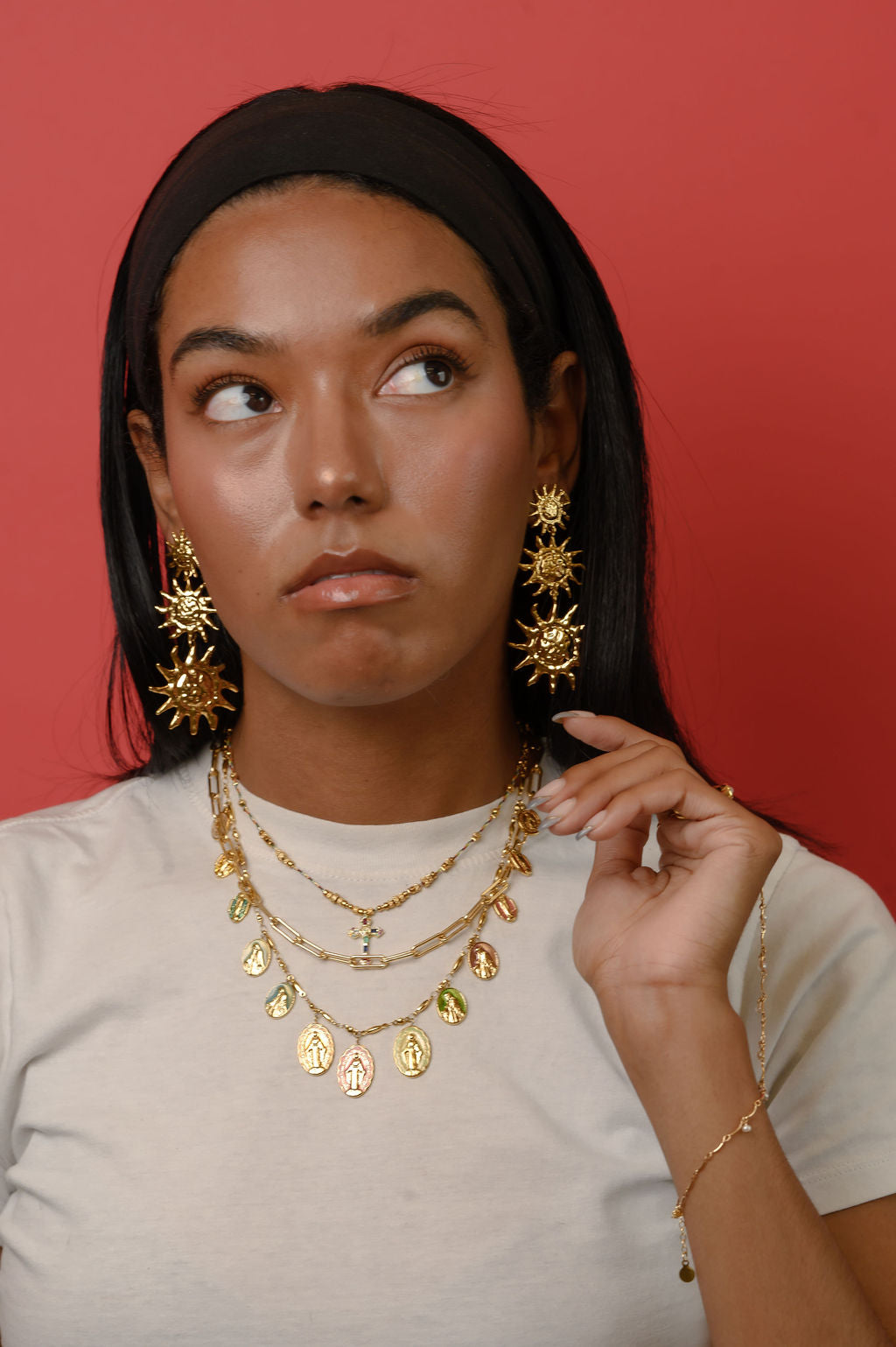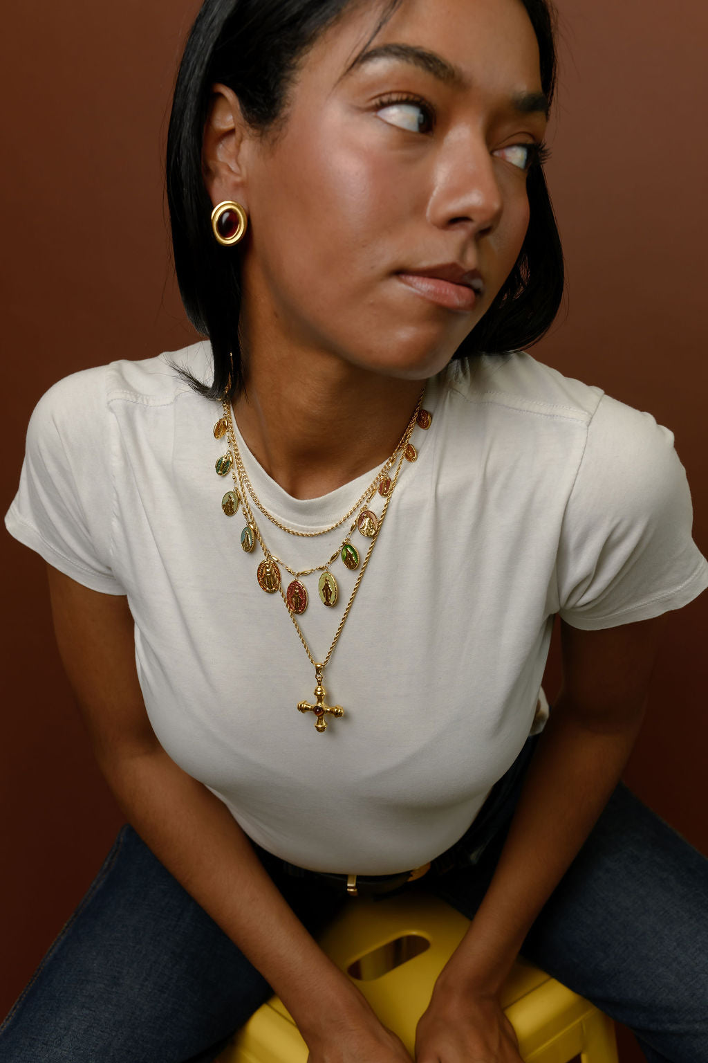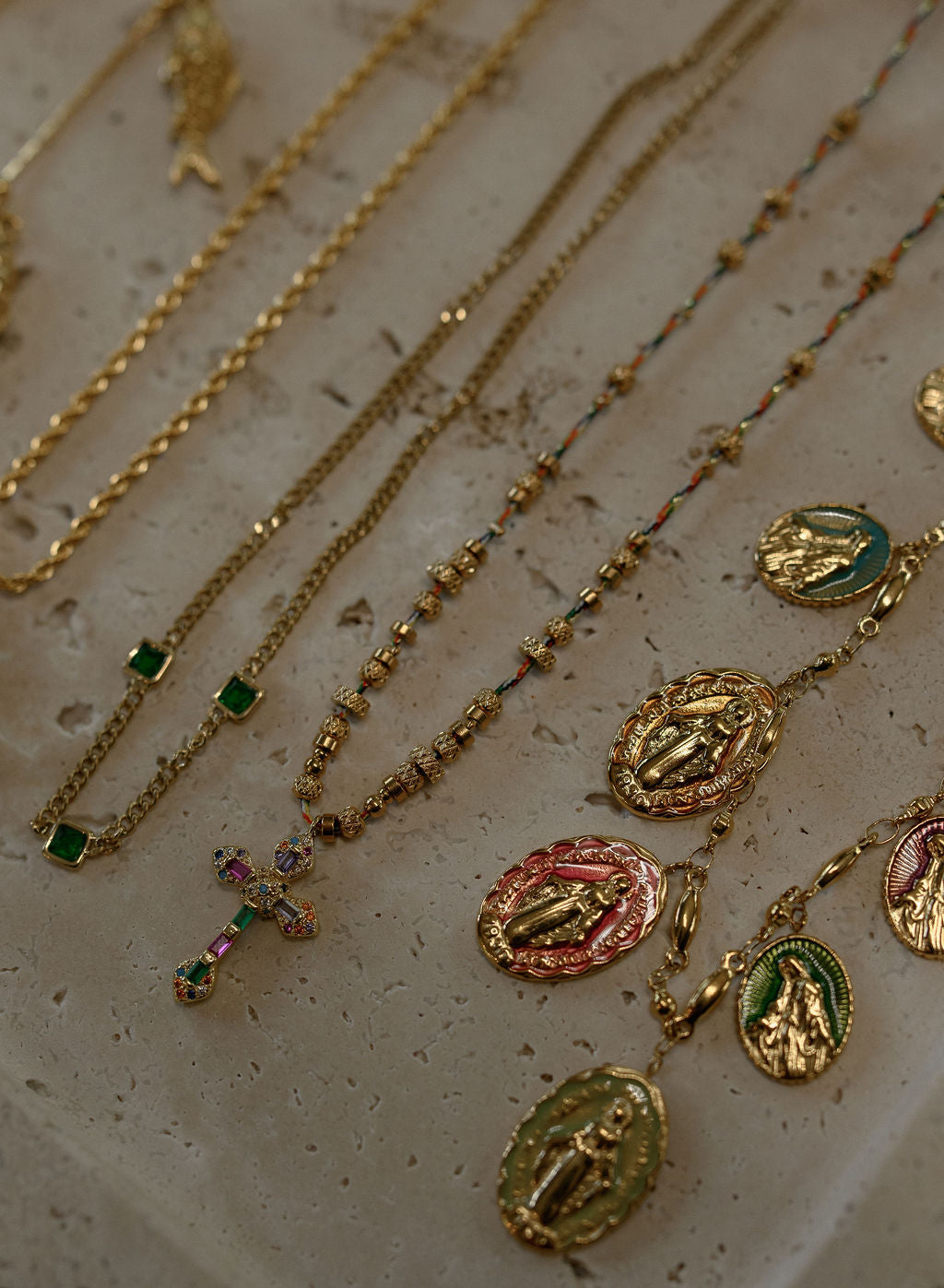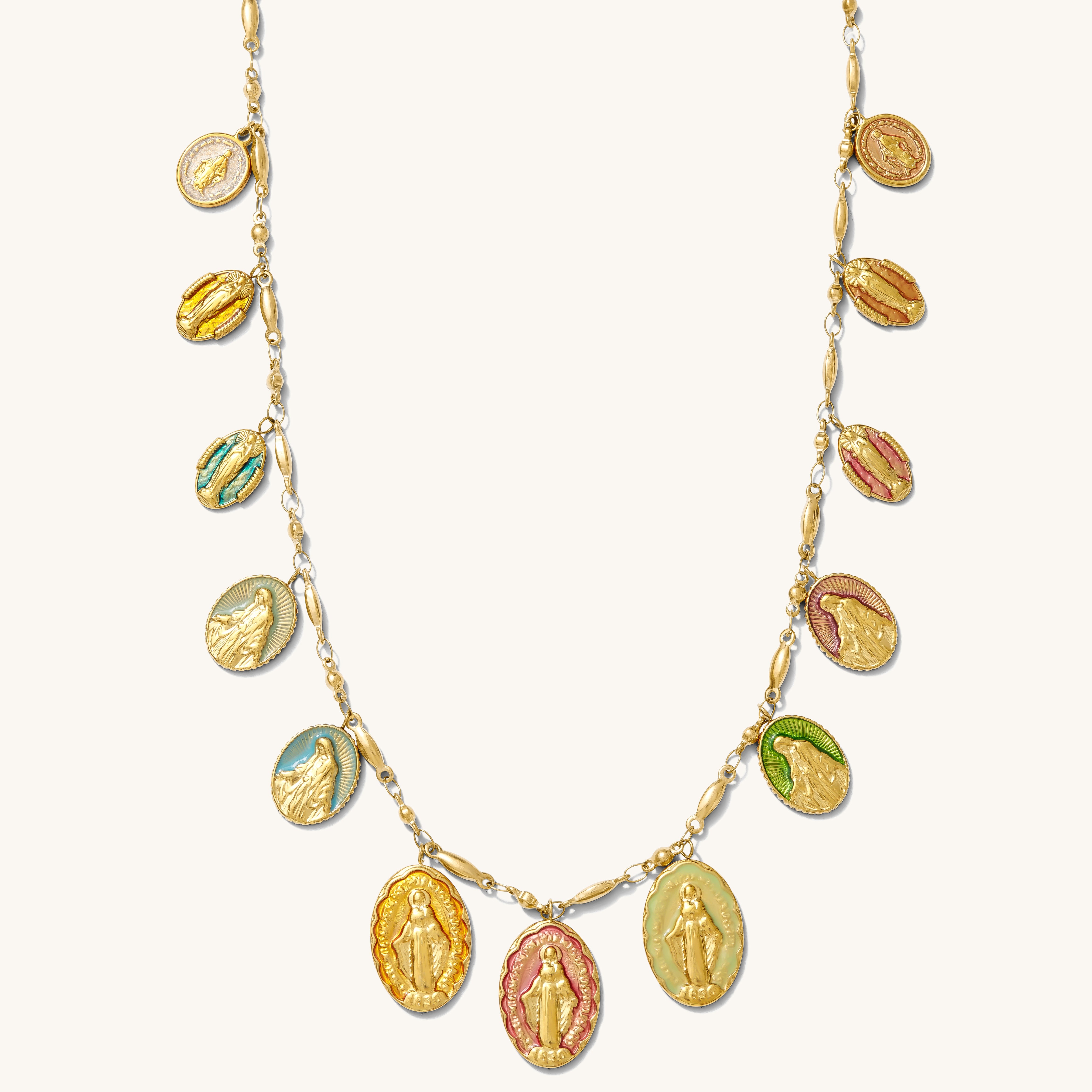 Not for the faint of heart, the Saints in Color Necklace truly dazzles in in its detail. With 13 saint coin charms in muted jewel tones, protection and beauty lie in each of the figures.