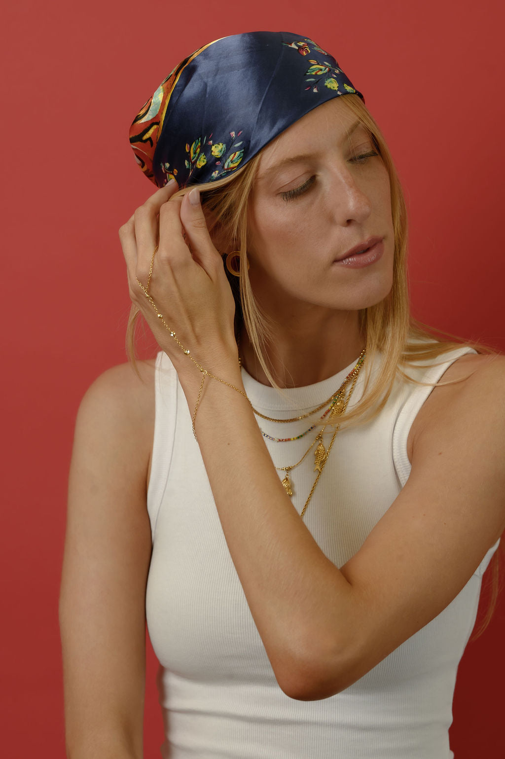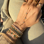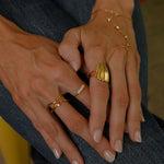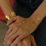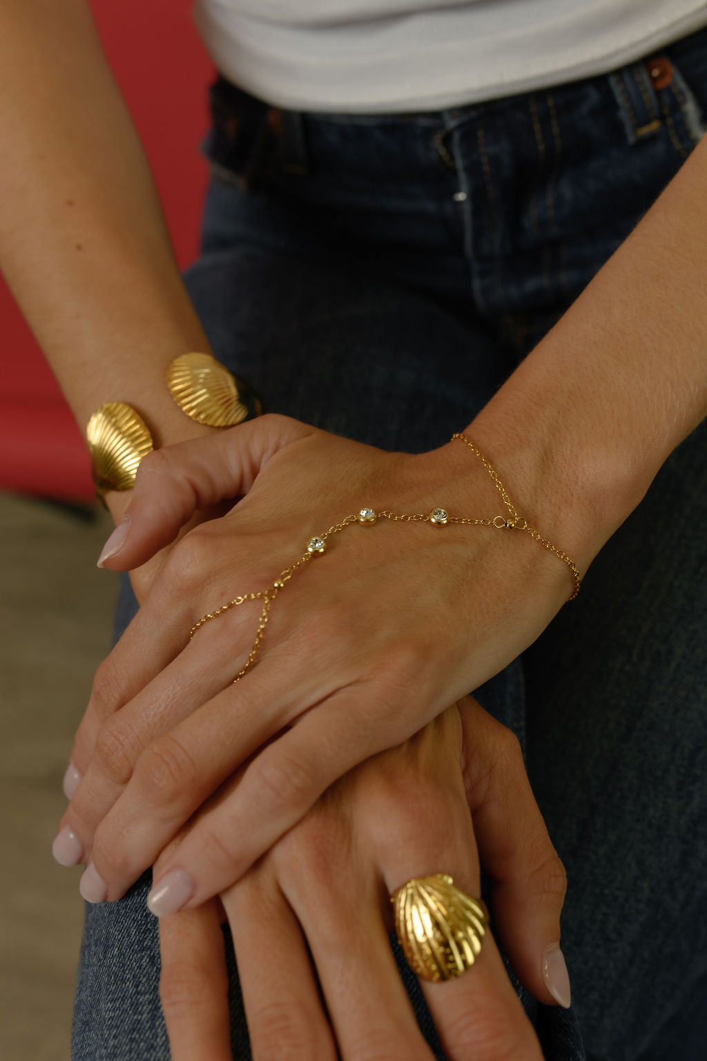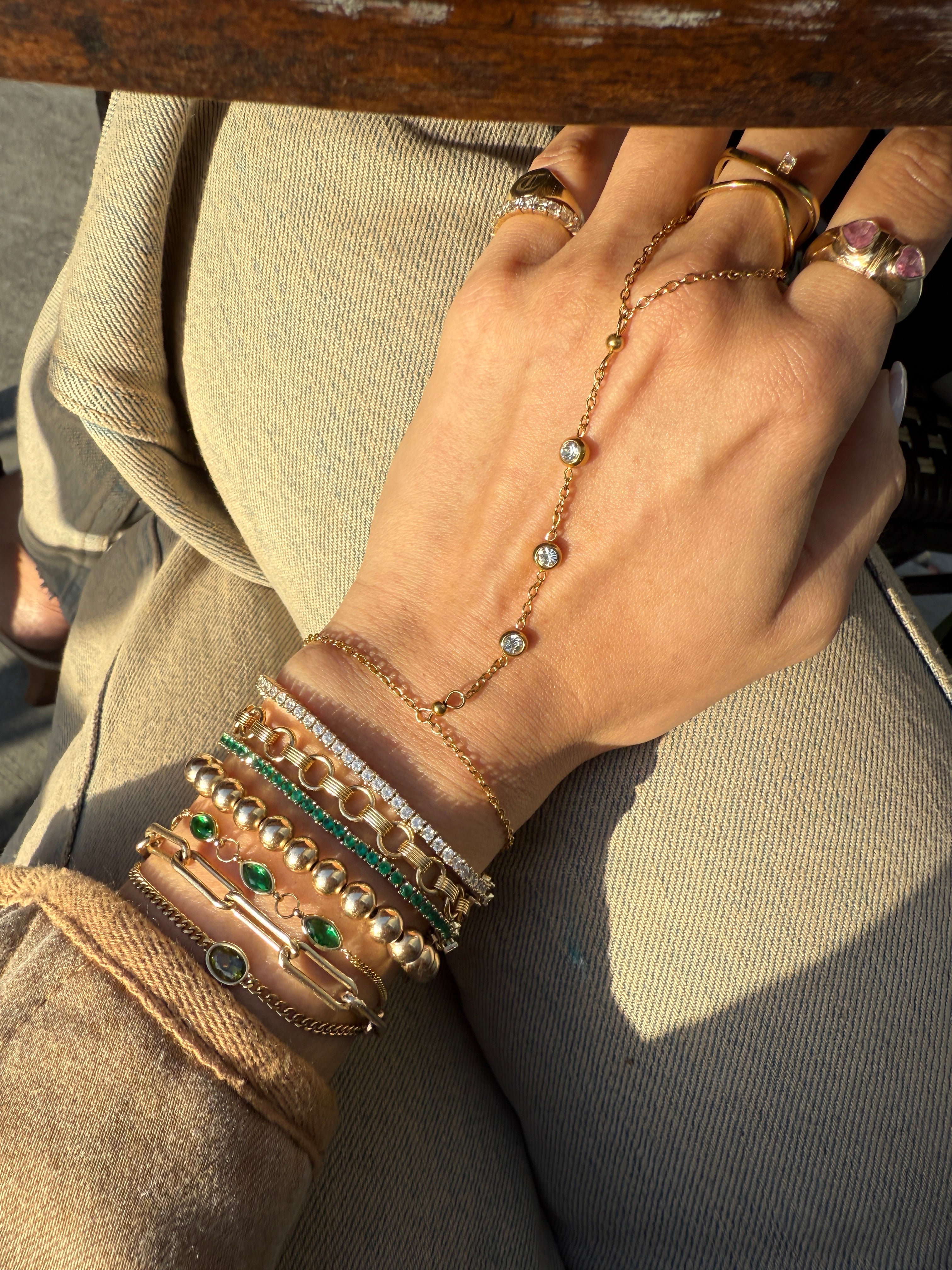 The Anna hand chain bracelet showcases the power of a simple hand chain. Simply featuring three bezel-set stones on the dainty chain, it's made to catch light, and attention - no matter what it's paired with.