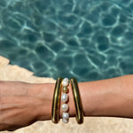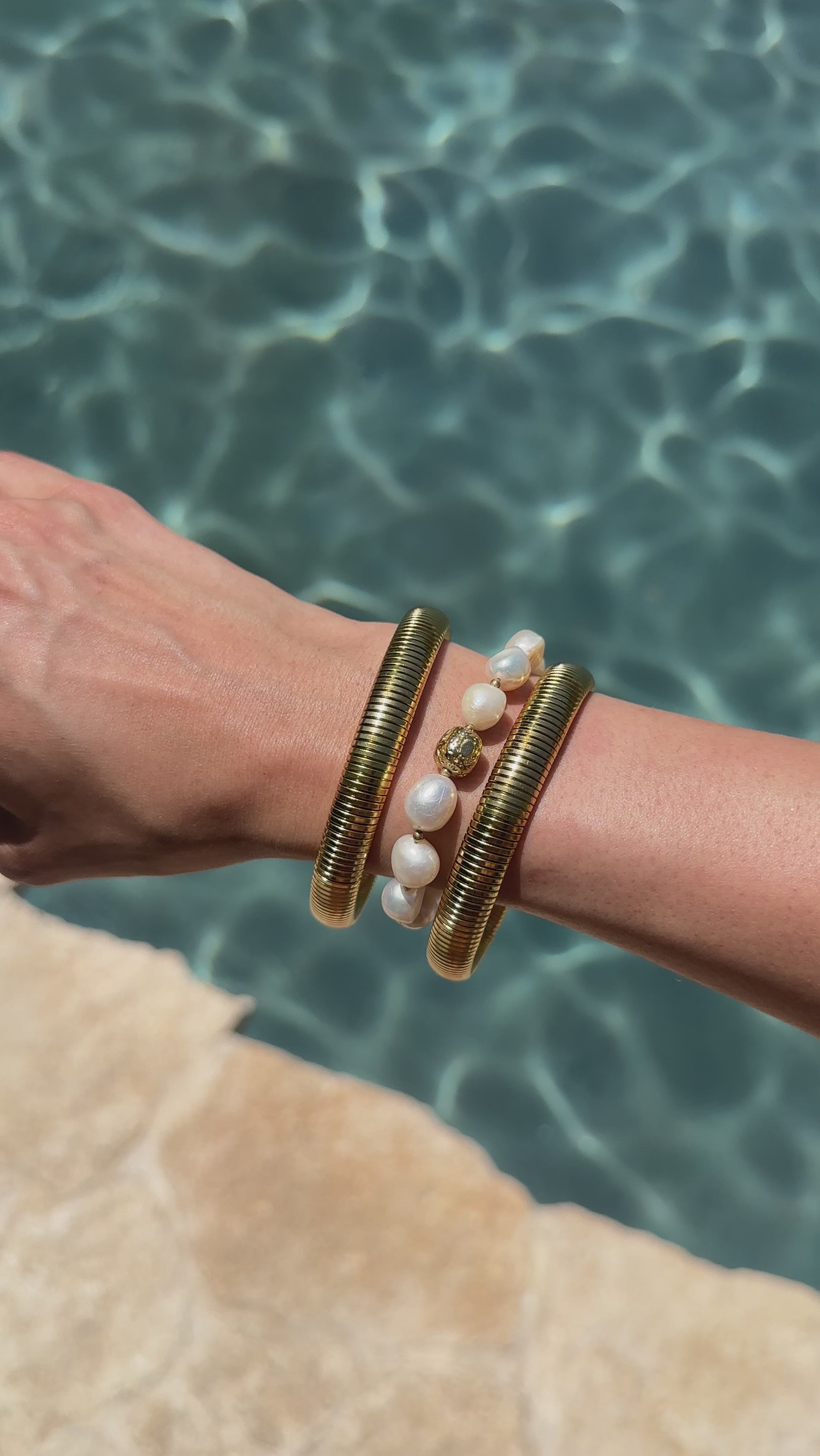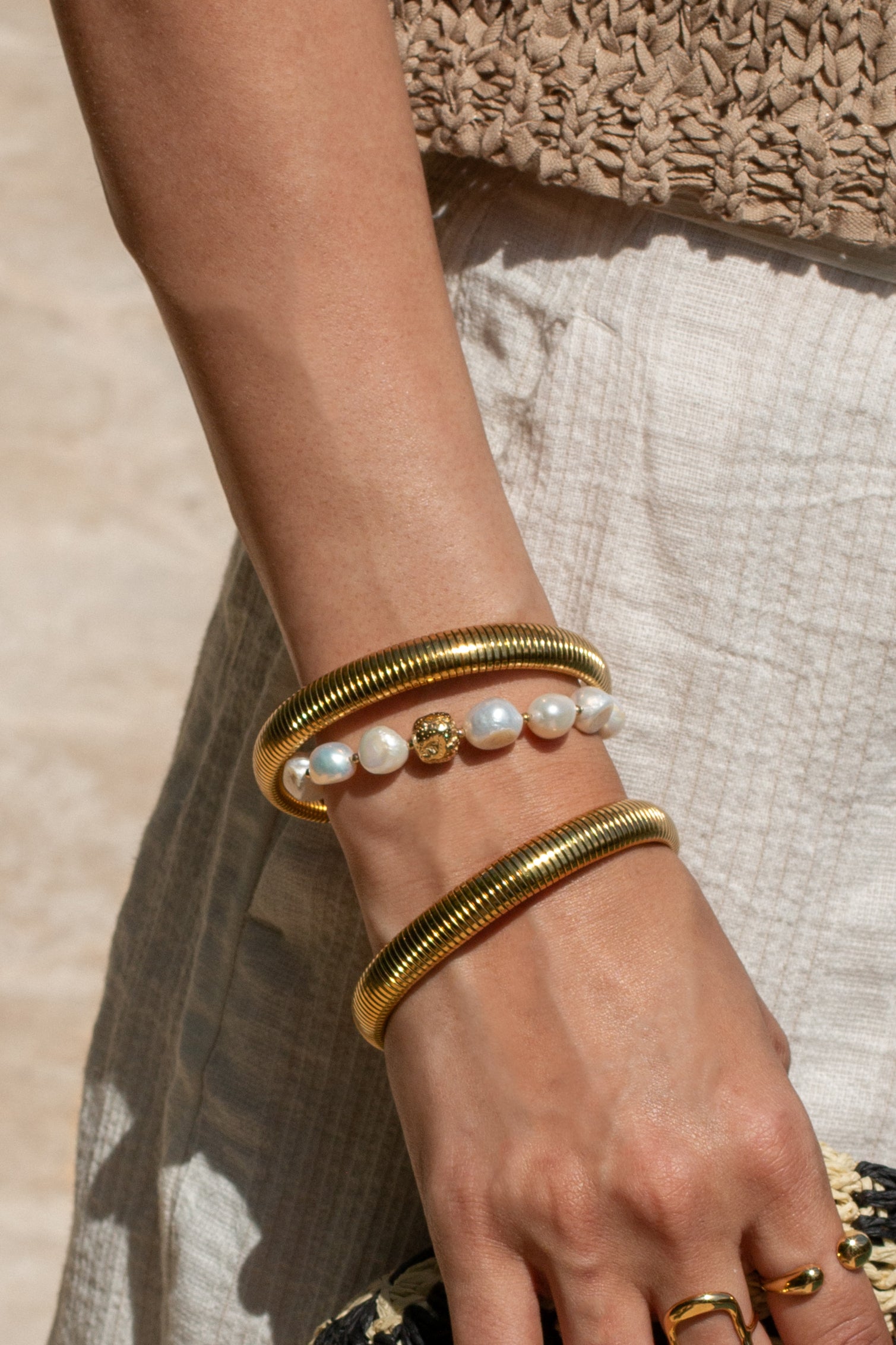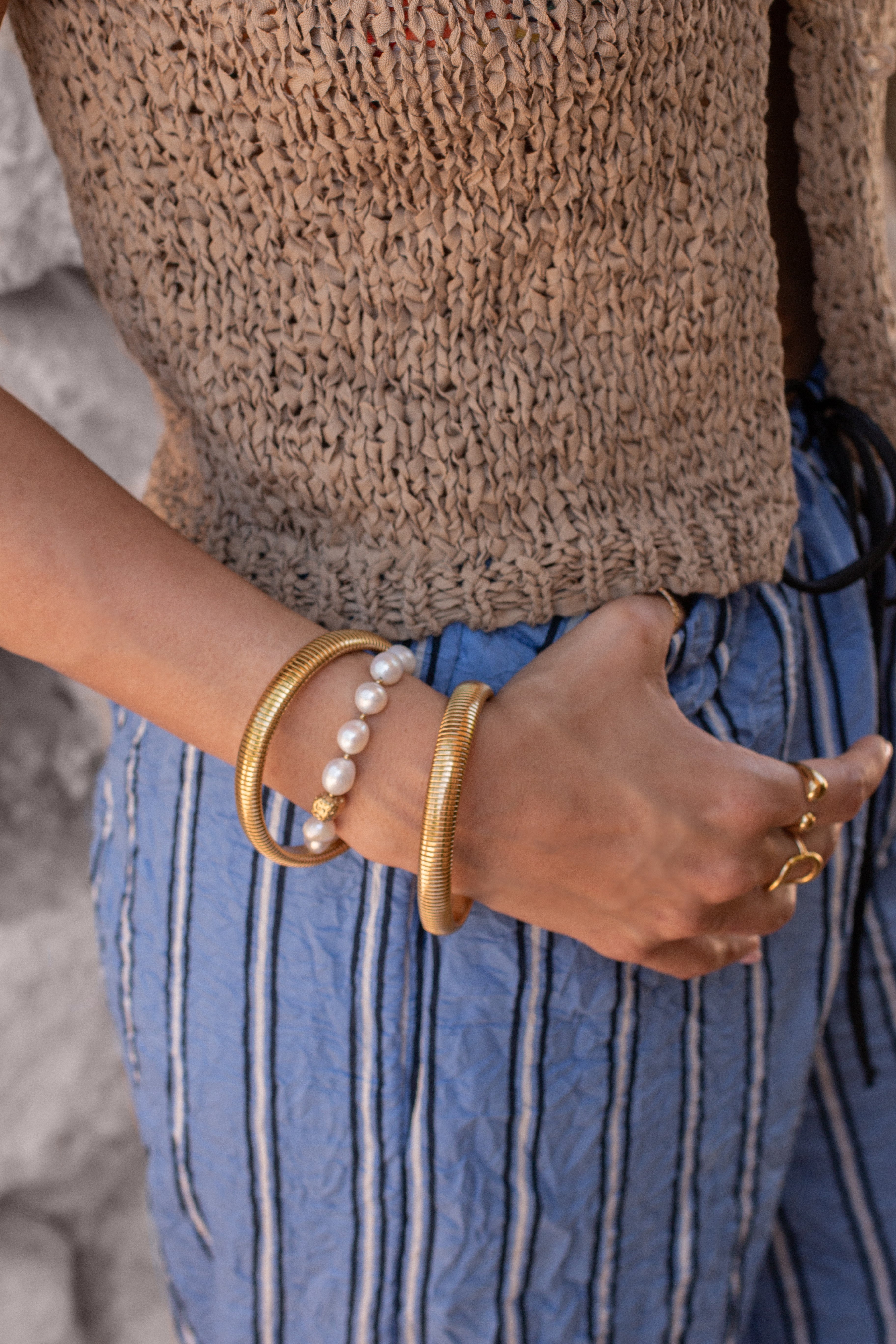 The Costa Thin Bracelet is our effortless, elevated version of a statement bracelet, with mini and bestselling thick styles available. Elastic and noise-free, this Tubogas style bracelet is easy to slide on and off. Perfect for elevating your look from tanning on the beach to elegant dinners, this bracelet is made to be lived in.