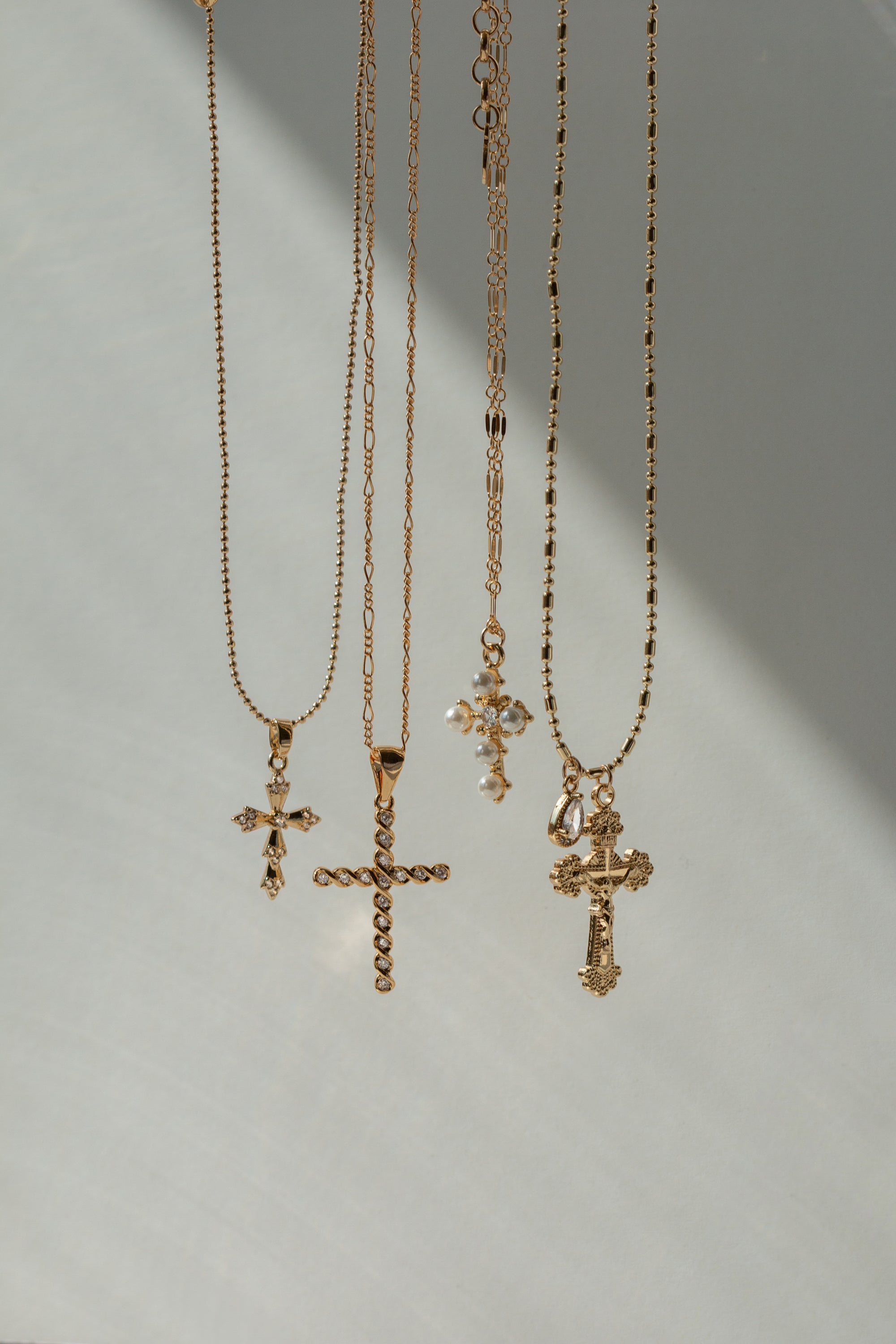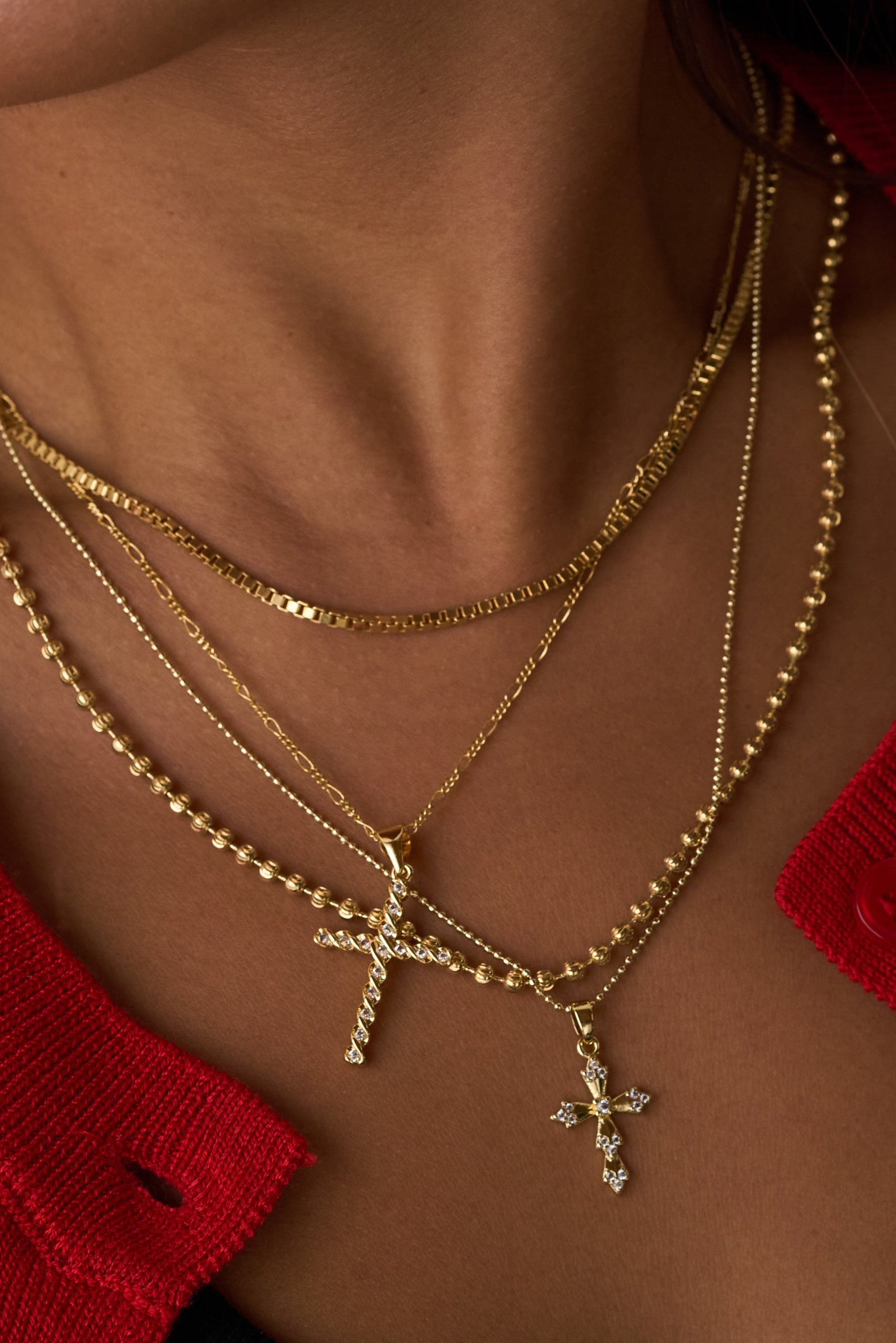 The Ezra Necklace is the perfect harmony of gold and shimmer in a classic shape. This isn't your average cross - this design features small CZ accents on each foot of the cross, creating dimension and sparkle from every angle.