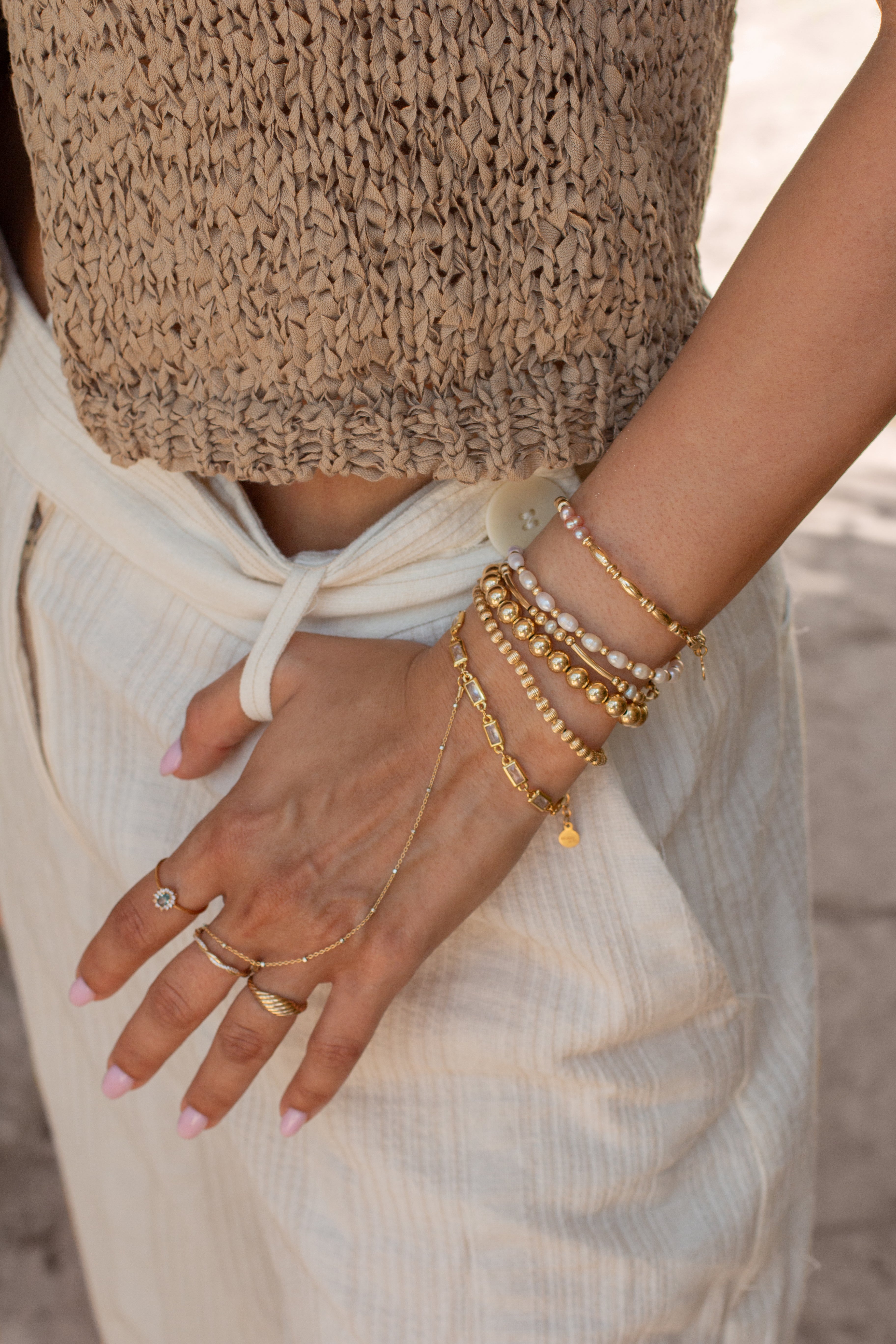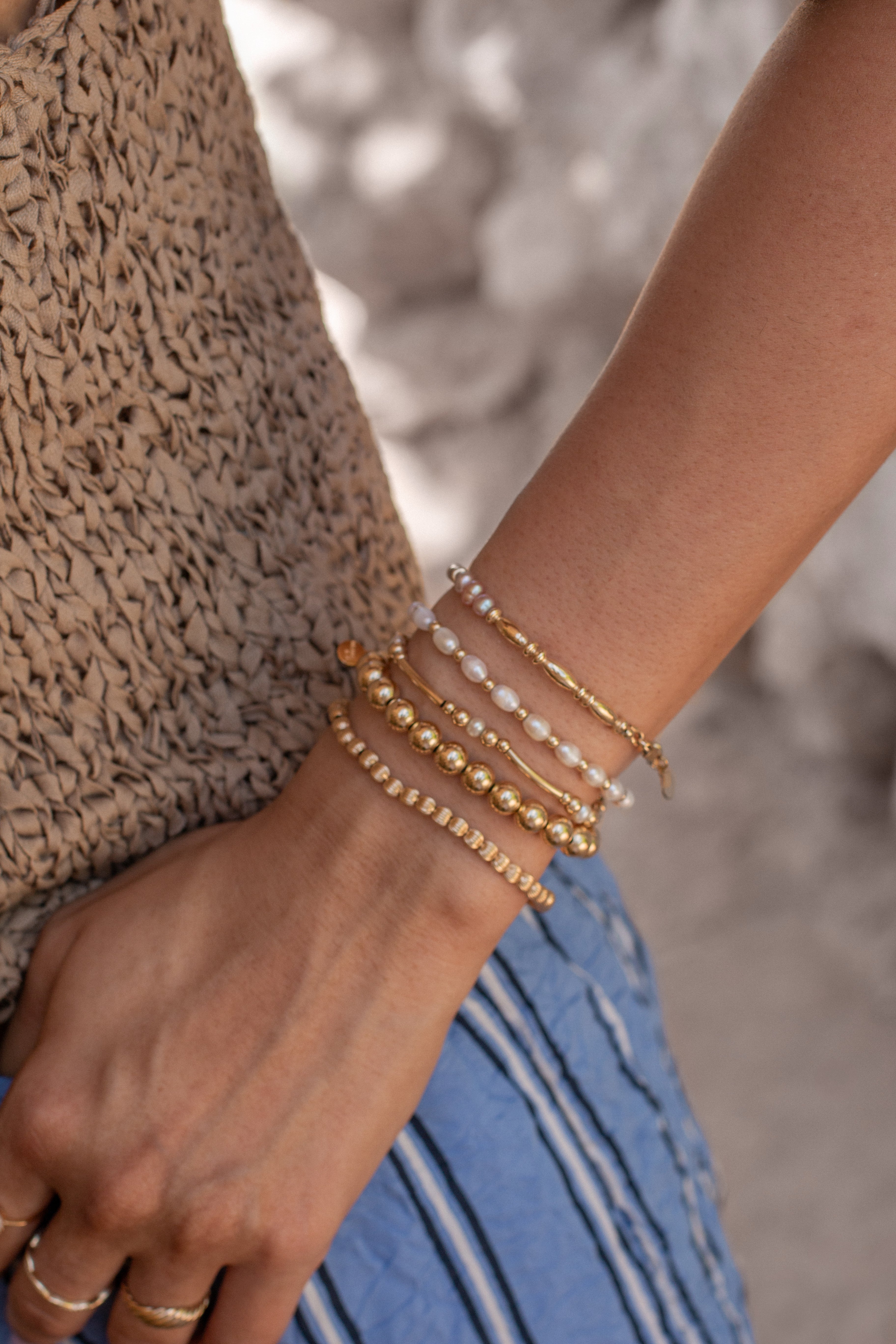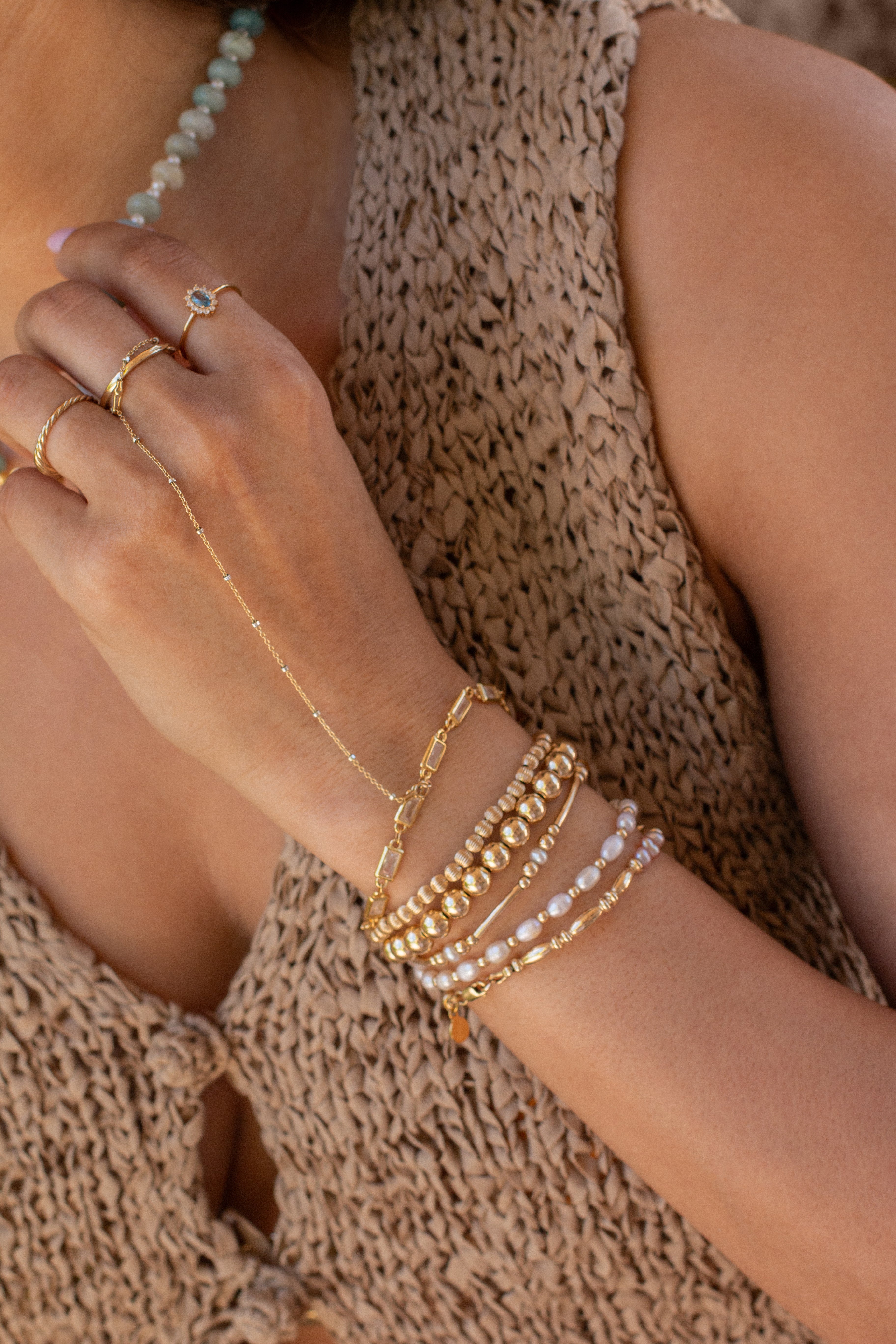 A summer twist on our Barb Bracelet, the Hanalei Bracelet has the perfect pearl accent for your stack. Alternating bead and bar elements make for a unique design that we love seeing paired with any BBT pieces.