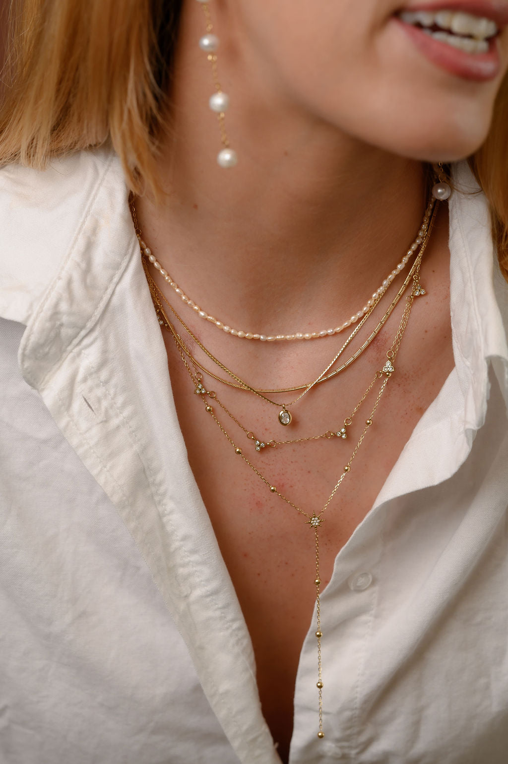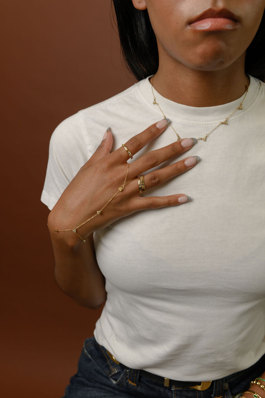 Our Lotus necklace features mini lotus-shaped stone clusters that will subtly adorn your neck. A symbol of growth and protection, this is the perfect everyday necklace. Add a glimmer of sparkle to your hands and grab the matching hand chain to complete the set.